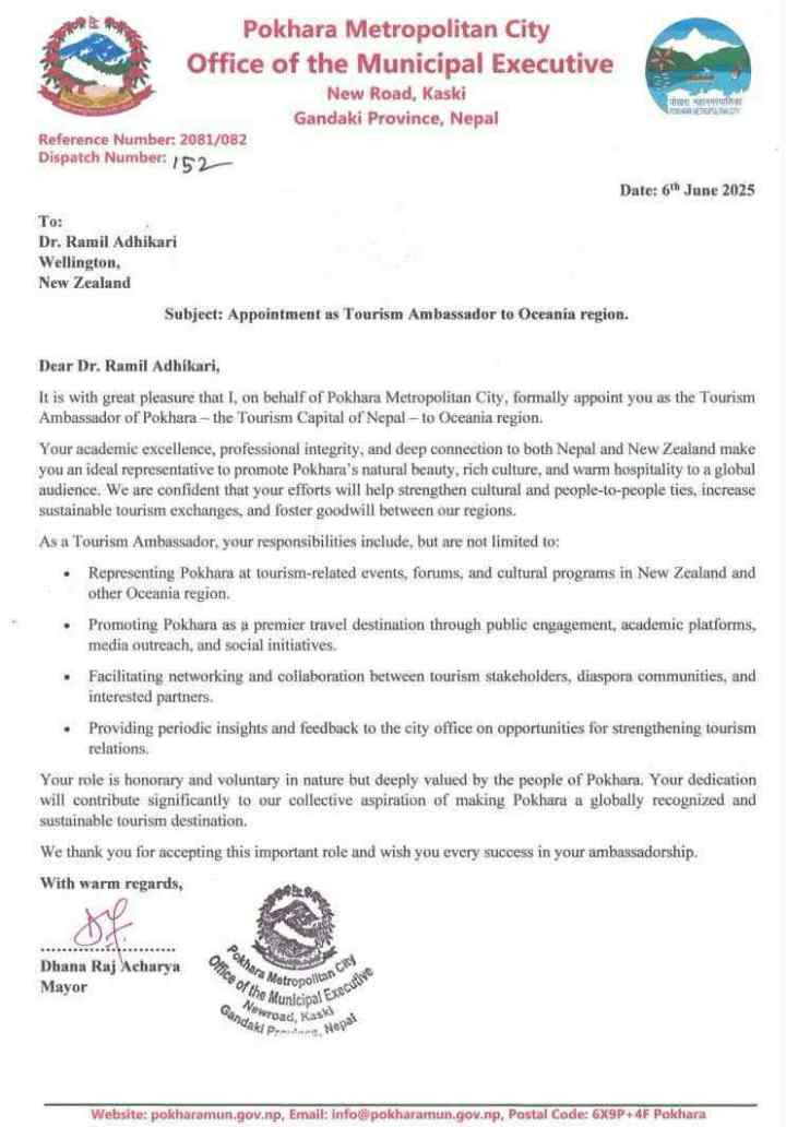 न्युजिल्याण्डस्थित नेपाली समुदायबीच सक्रिय र शैक्षिक तथा पेशागत क्षेत्रमा ख्यातिप्राप्त डा. अधिकारीलाई औपचारिक नियुक्तिपत्र प्रदान गर्दै महानगरले पोखराको प्राकृतिक सौन्दर्य, सांस्कृतिक सम्पदा र आतिथ्य संस्कृतिको विश्वव्यापी प्रवद्र्धनमा योगदान हुने विश्वास व्यक्त गरेको छ।