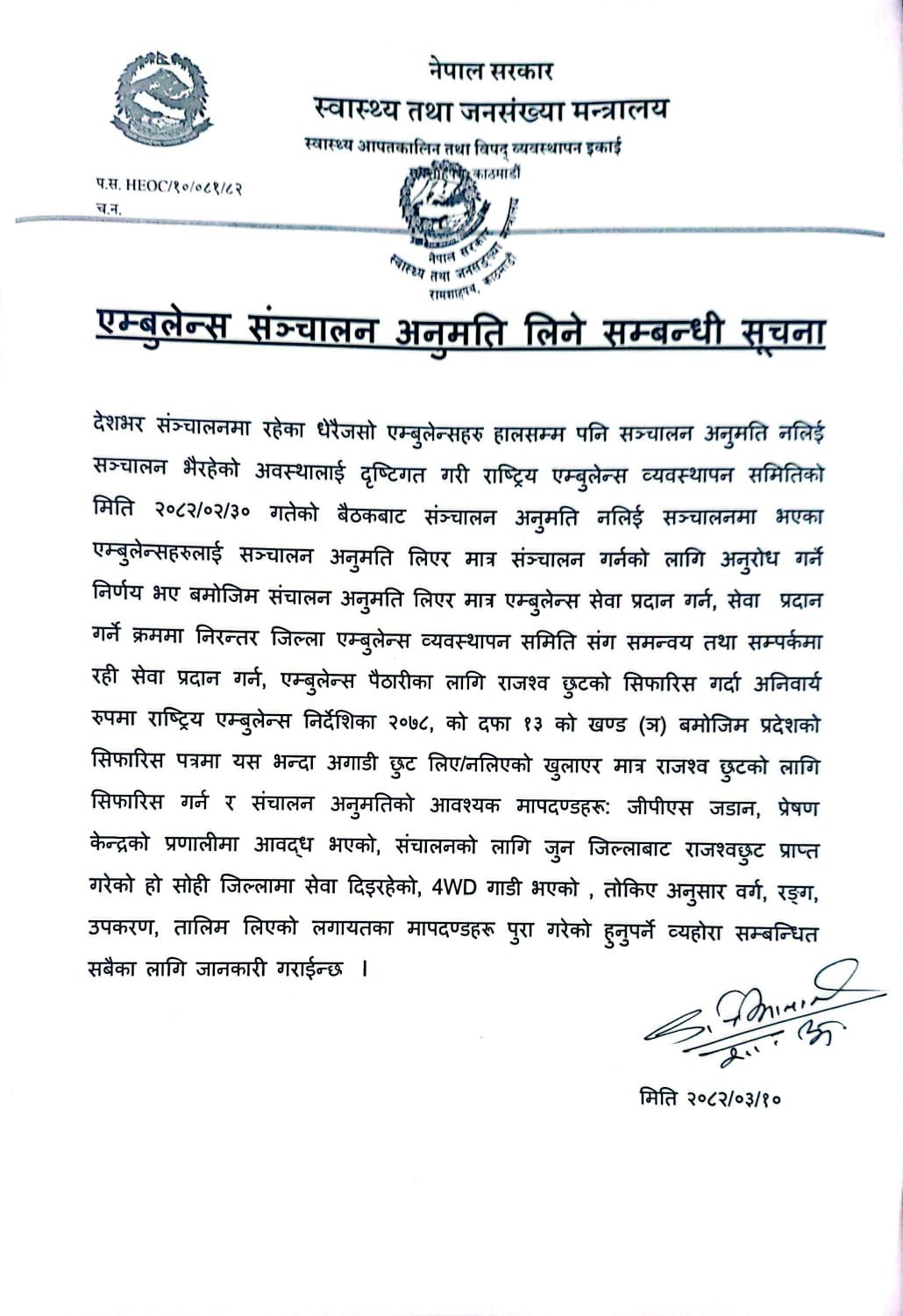 स्वास्थ्य मन्त्रालयले सबै एम्बुलेन्स सञ्चालक, सम्बन्धित निकाय तथा सेवा प्रदायकहरूलाई यथाशीघ्र आवश्यक अनुमति लिई कानुनी रूपमा सेवा संचालन गर्न अनुरोधसमेत गरेको छ।