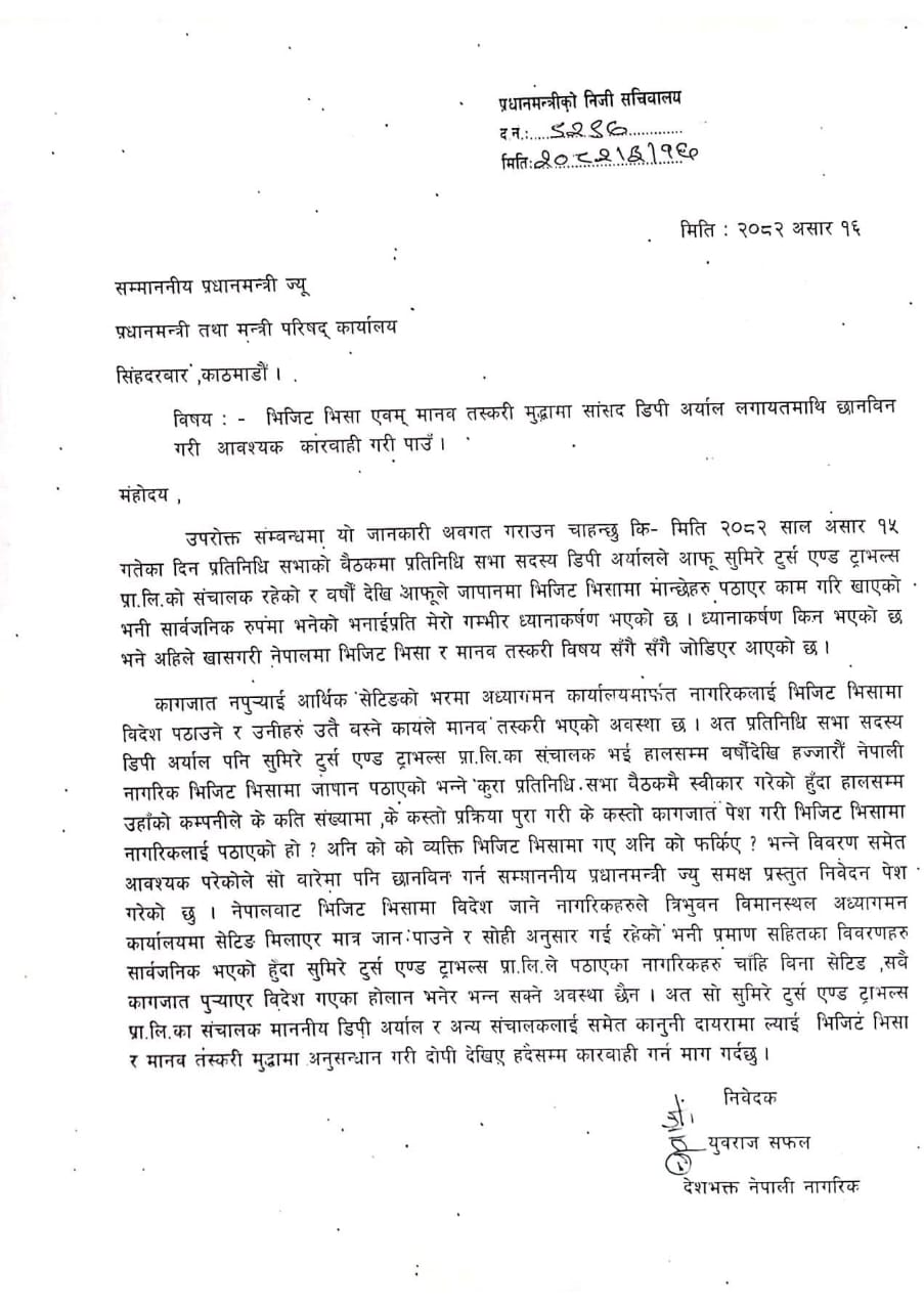 उनले दर्ता गराएको निवेदनमार्फत भनेका छन्, ‘भिजिट भिसाको नाममा ‘सेटिङ’ गरेर त्रिभुवन विमानस्थल हुँदै नागरिक विदेश पठाइएको प्रमाणहरू सार्वजनिक भइसकेका छन्। यस्तोमा अर्यालको कम्पनीले कागजात पूरा गरेर नागरिक पठाएको स्विकार्न सकिन्न।’