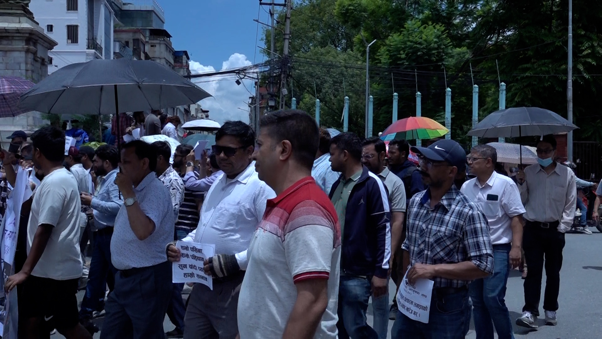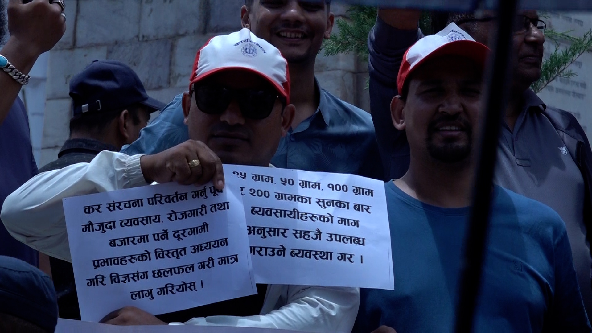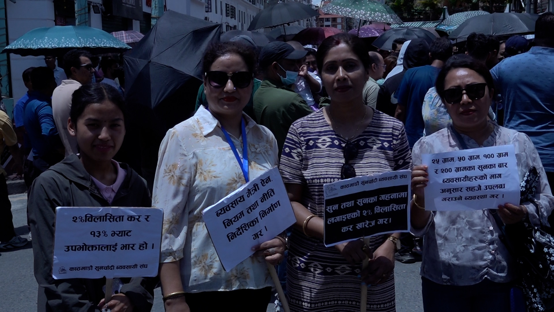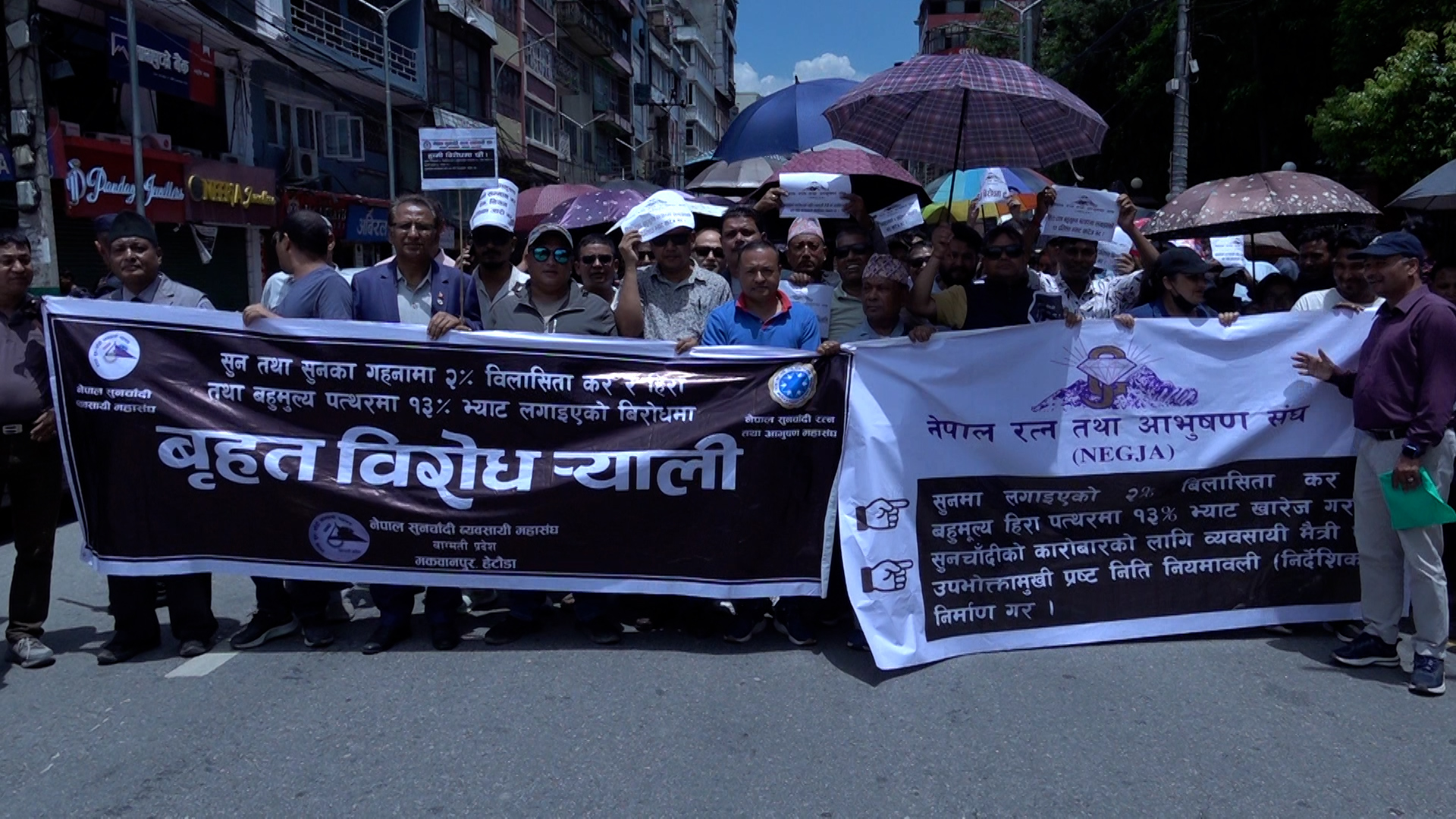 विरोध कार्यक्रममा सहभागी व्यवसायीहरूले प्लेकार्ड र ब्यानरसहित प्रदर्शन गर्दै आफ्नो असन्तोष व्यक्त गरेका थिए।