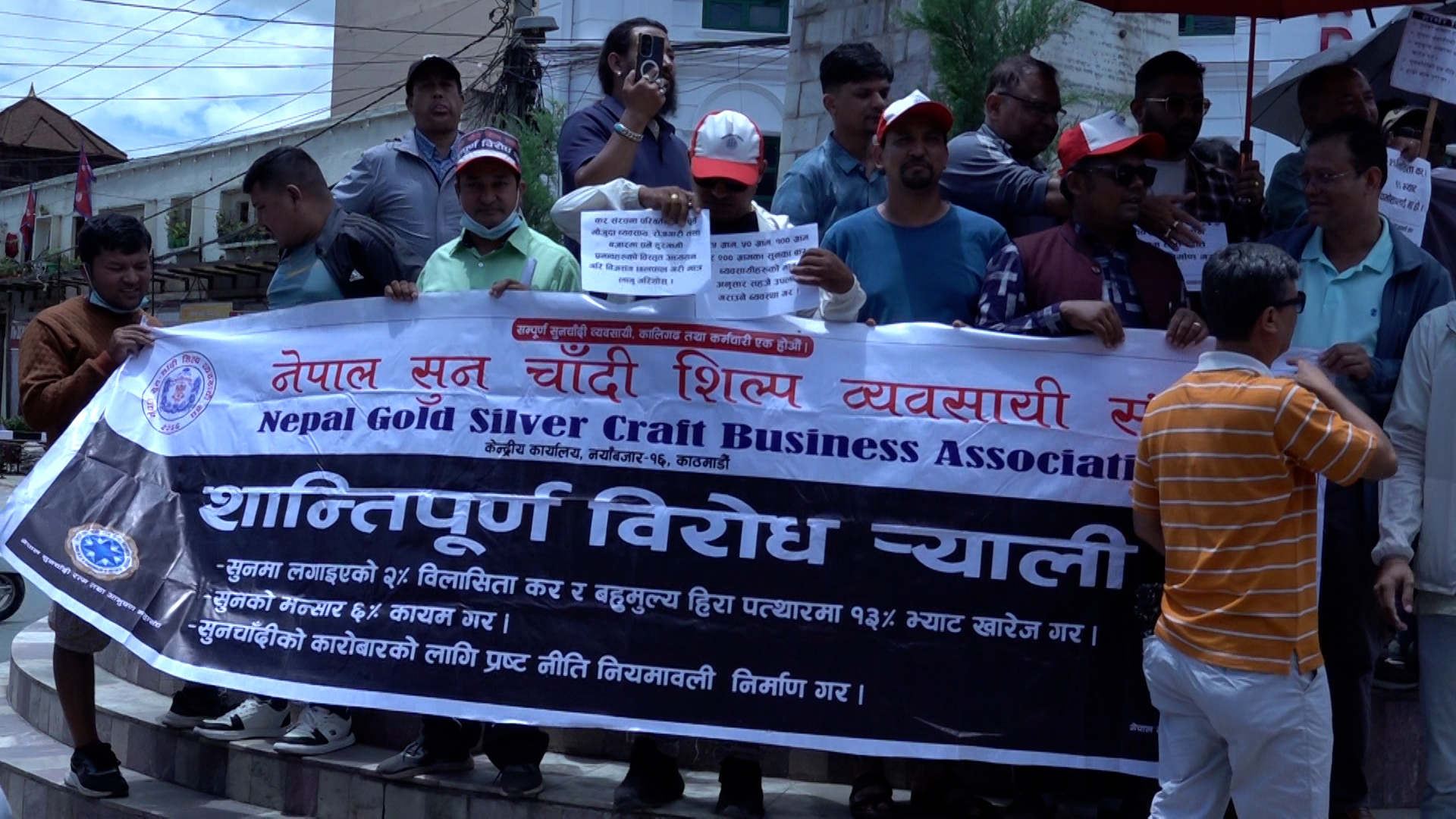 उनीहरूले २५ ग्राम, ५० ग्राम, १०० ग्राम र २०० ग्रामका सुनका बार व्यवसायीहरूको माग अनुसार सहजै उपलब्ध गराउने व्यवस्था गर। व्यवसायमैत्री ऐन नियम तथा नीति निर्देशिका निर्माण गर, हामी व्यवसायी र कालिगढहरूलाई विस्थापित गर्न पाईँदैन जस्ता प्लेकार्ड र ब्यानरसहित प्रदर्शन गरेका हुन्।
