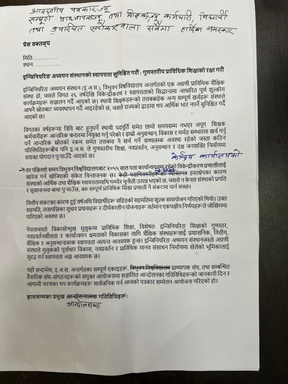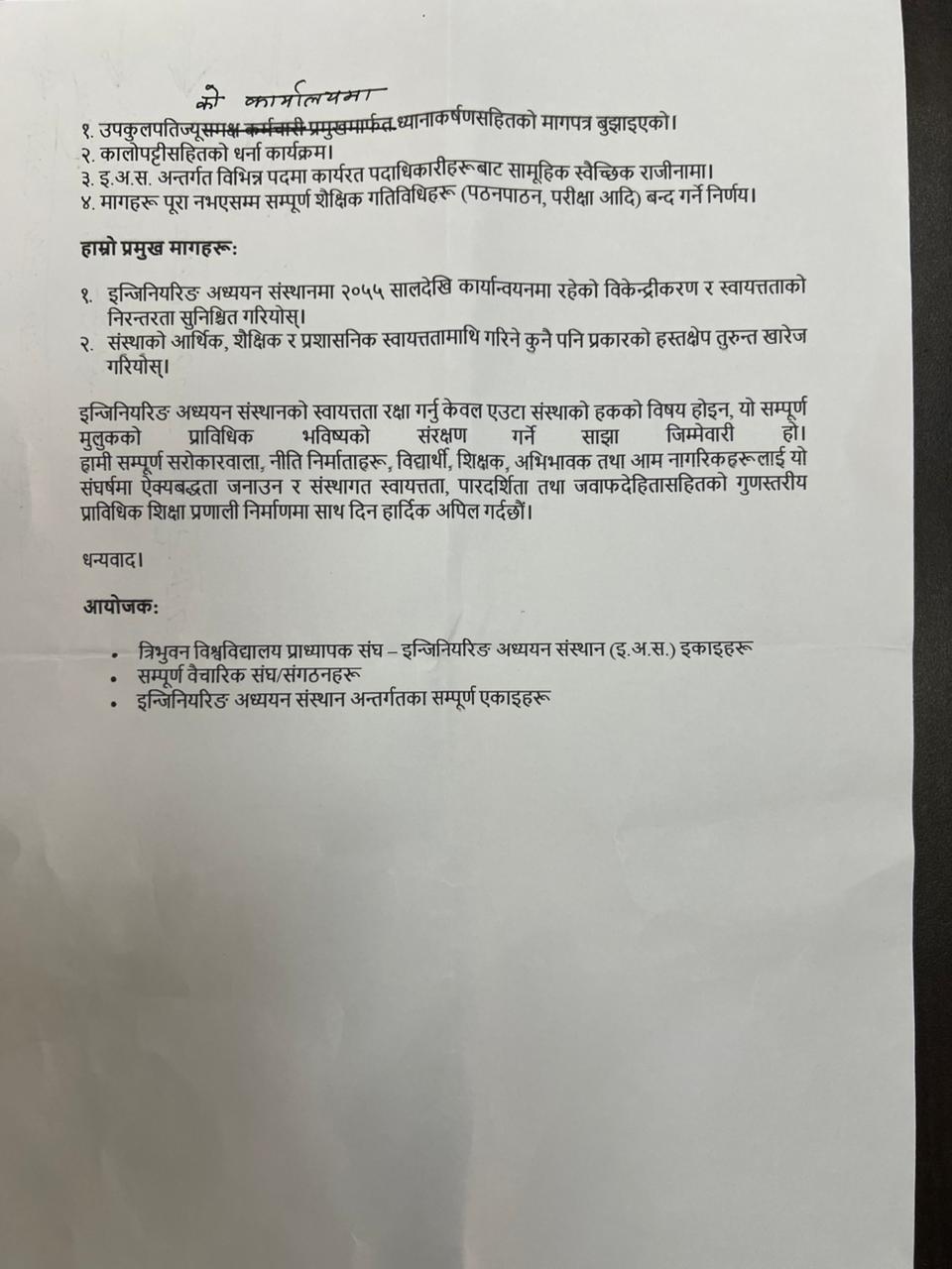 इन्जिनियरिङ अध्ययन संस्थानको आन्दोलनका थप कार्यक्रमहरु सार्वजनिक