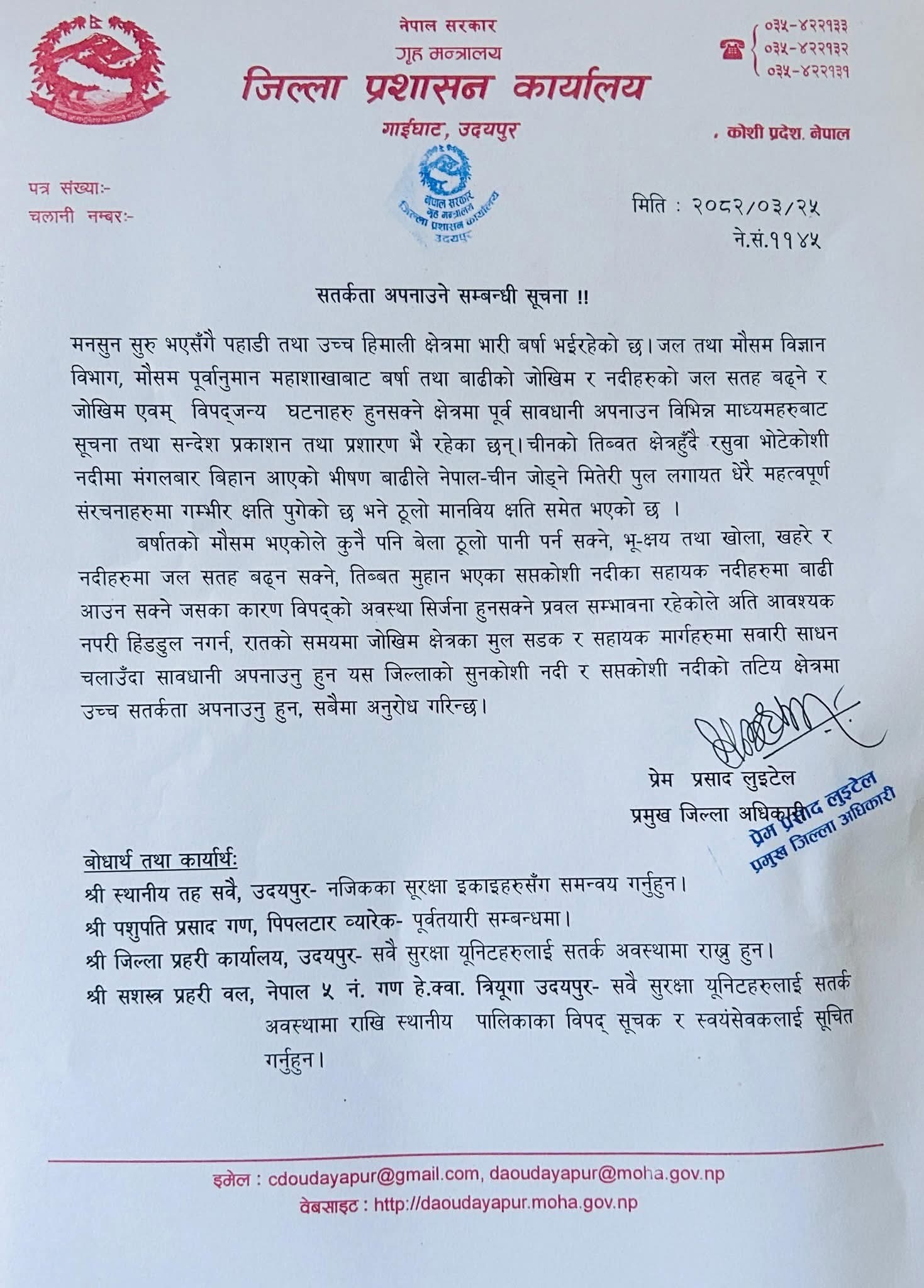 साथै मनसुन सुरु भएसँगै पहाडी तथा उच्च हिमाली क्षेत्रमा भारी वर्षा भइरहेकाले जिल्लाका विपद् टोलीहरूलाई पूर्वयारी गर्न समेत अनुरोध गरिएको छ।