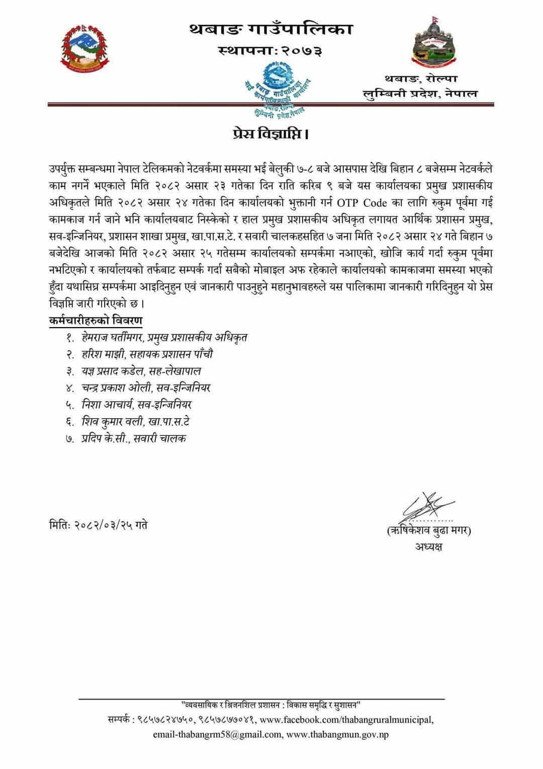 असार २४ गतेदेखि बुधबारसम्म कर्मचारीहरुसँग सम्पर्क हुन नसकेको भन्दै गाउँपालिकाका अध्यक्ष ऋषिकेशव बुढा मगरले विज्ञप्ति जारी गरेका छन्।