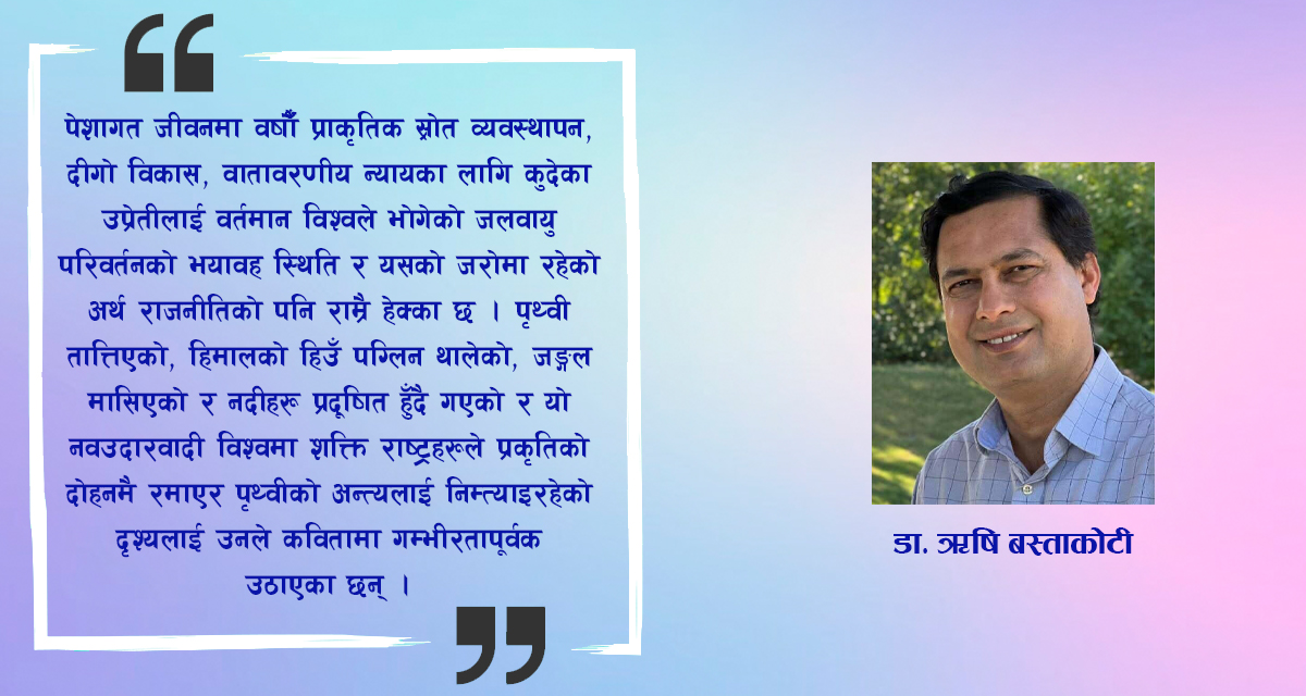 पृथ्वी तात्तिएको, हिमालको हिउँ पग्लिन थालेको, जङ्गल मासिएको र नदीहरू प्रदूषित हुँदै गएको र यो नवउदारवादी विश्वमा शक्ति राष्ट्रहरूले प्रकृतिको दोहनमै रमाएर पृथ्वीको अन्त्यलाई निम्त्याइरहेको दृश्यलाई उनले कवितामा गम्भीरतापूर्वक उठाएका छन्।