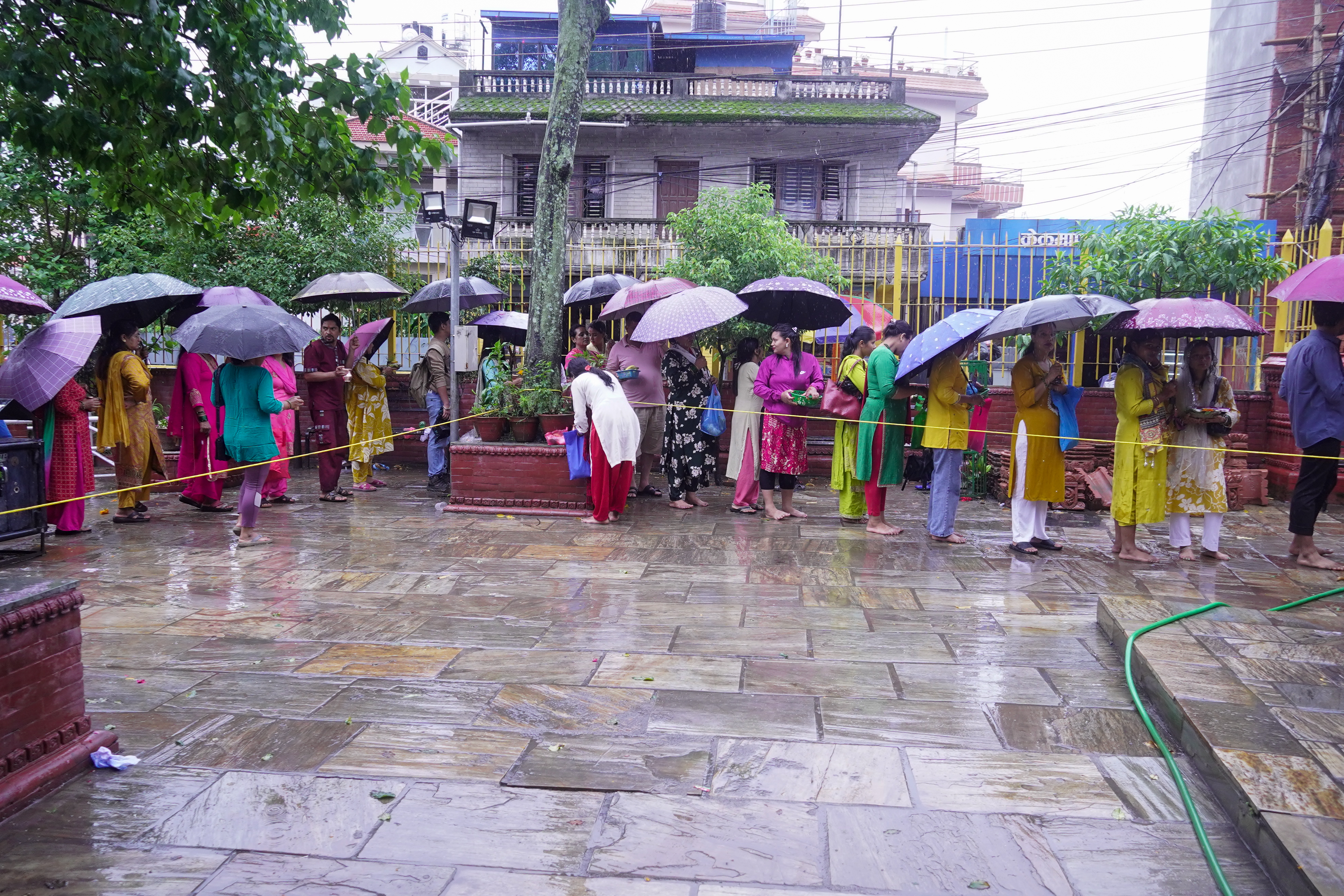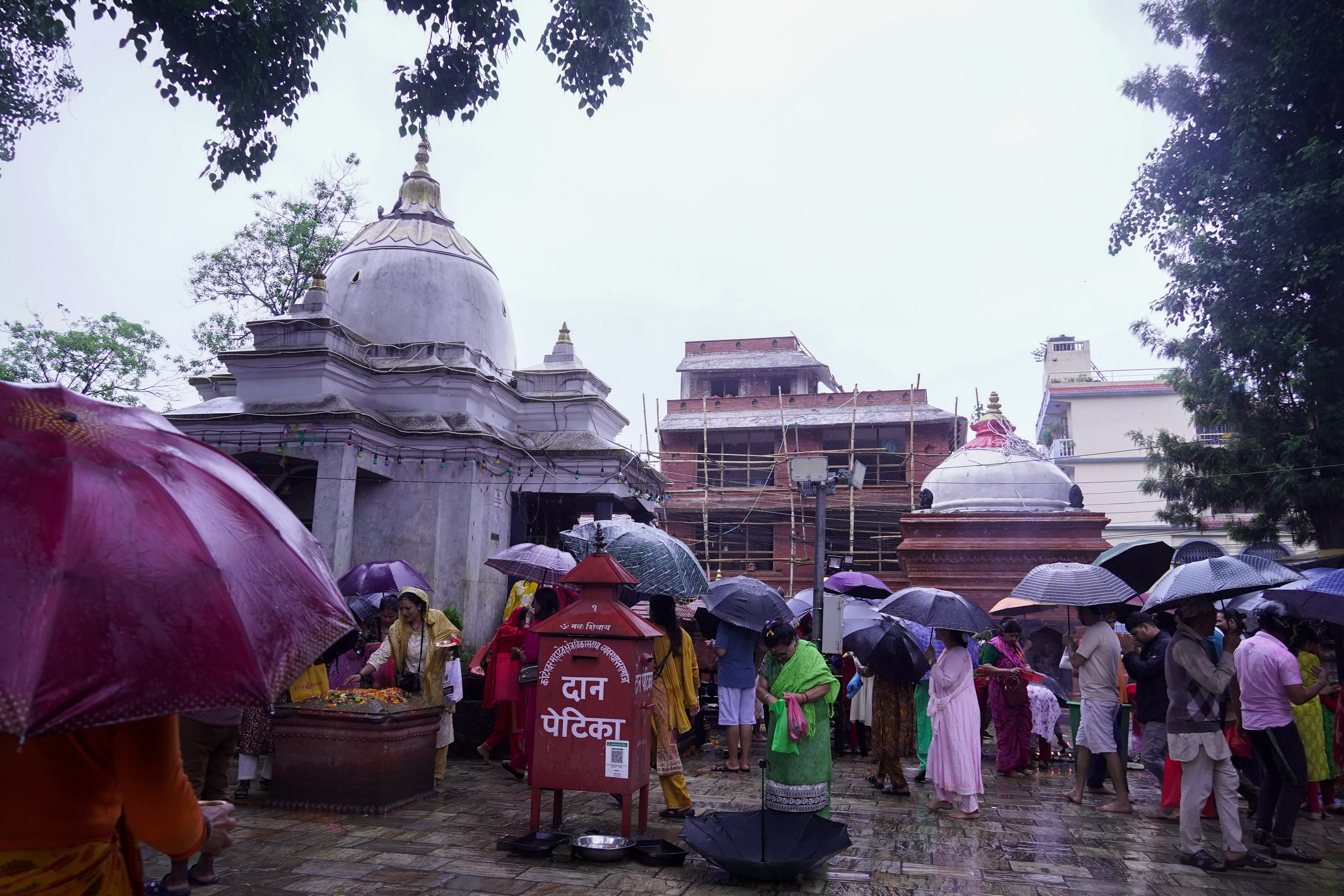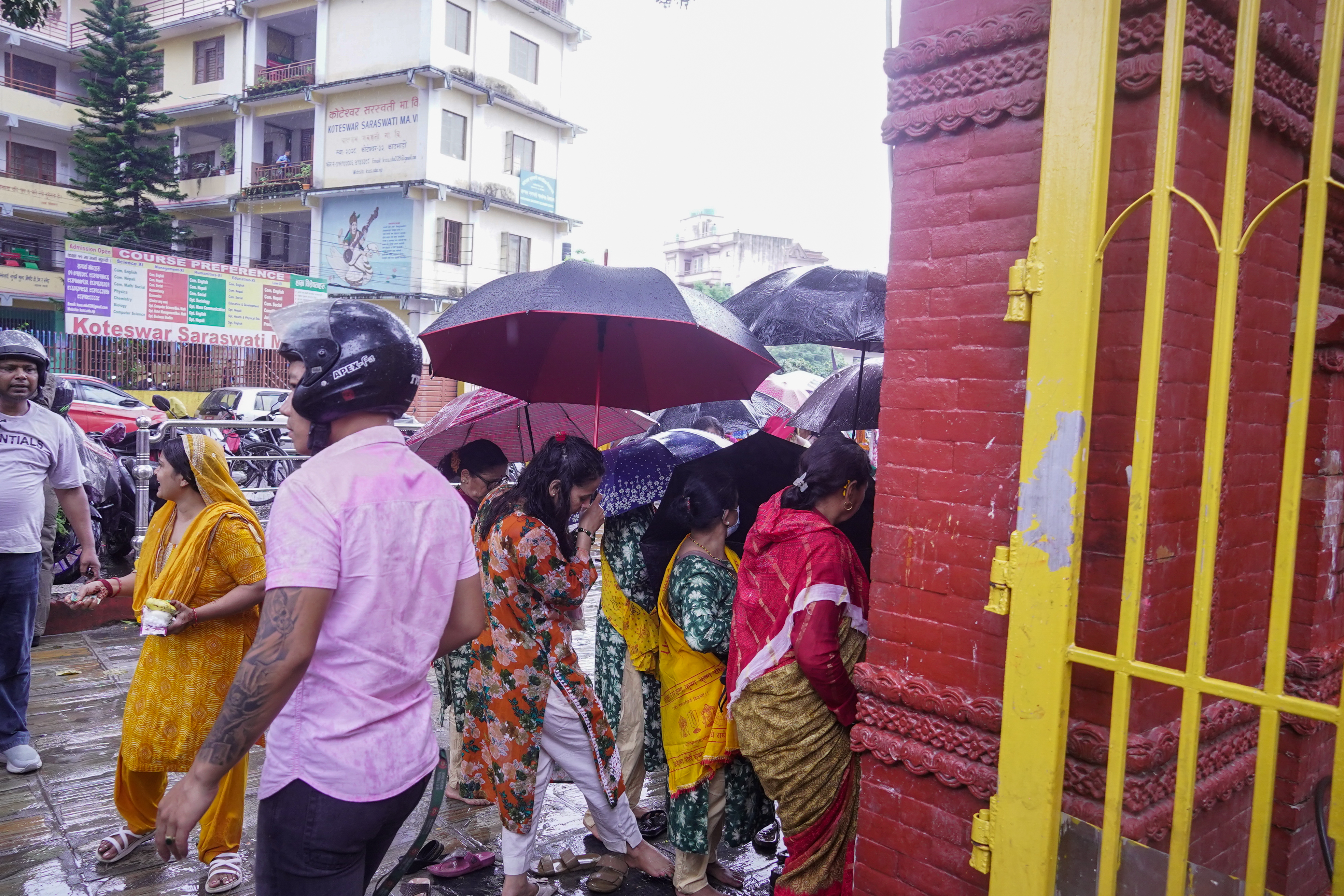 काठमाडाैं। साउनको दोस्रो सोमबार शिवालयहरूमा भक्तजनको भीड छ। गए रातिदेखिको निरन्तरको वर्षाका बाबजुद पनि भक्तजनहरु छाता ओढेर काठमाडौं कोटेश्वर स्थित महादेवस्थान पुगेका छन्। महादेवस्थान मन्दिरमा साउन महिनाको सोमवार विशेष पूजाआजा हुने हुँदा भक्तजनको भीड लाग्ने गरेको छ।