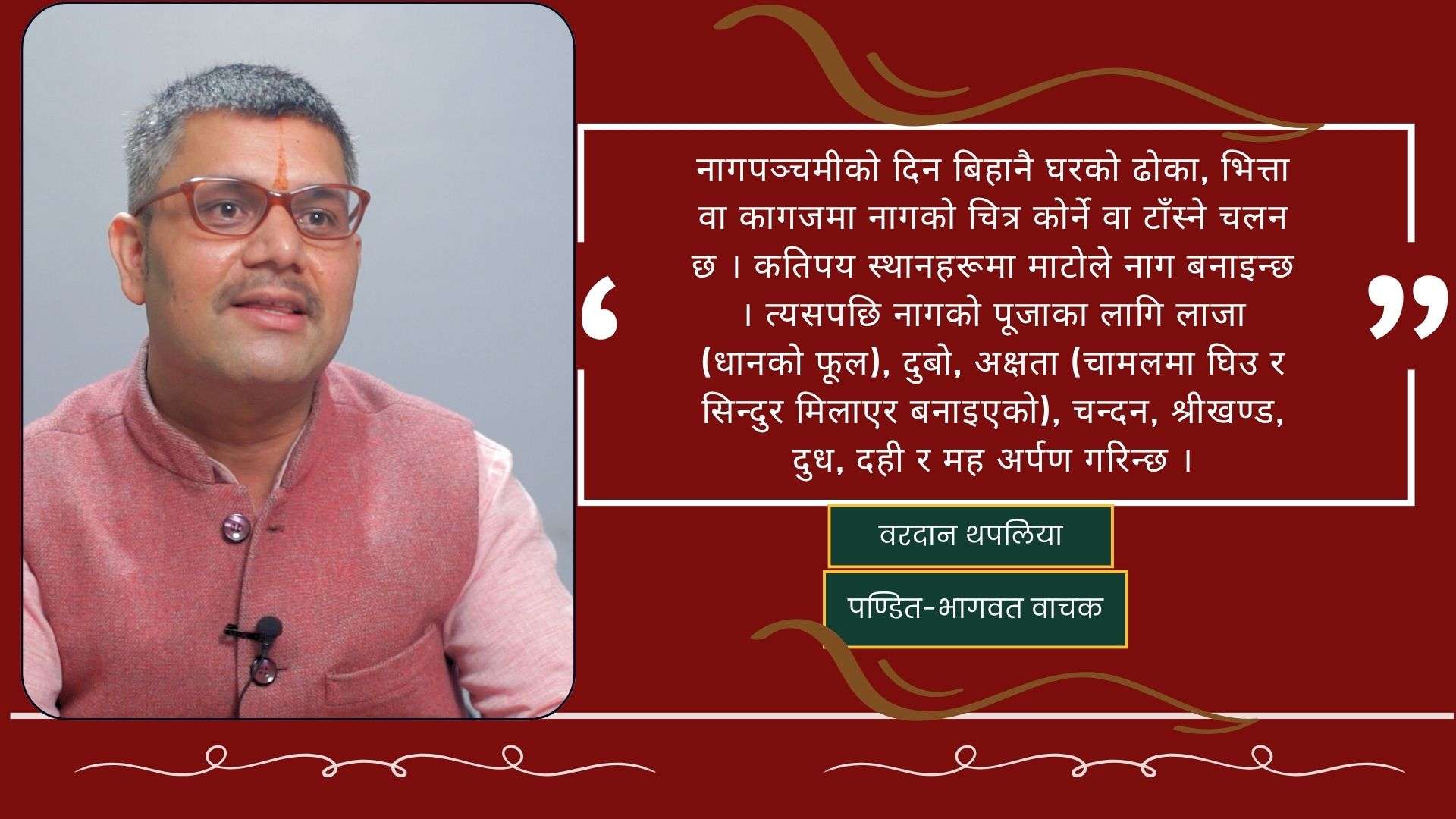 यसै सन्दर्भमा नेपालन्यूज बैंकसँगको कुराकानीमा पण्डित- भागवत वाचक वरदान थपलियाले हिन्दू धर्मग्रन्थहरूमा सर्पलाई शक्तिशाली, संरक्षणकारी तथा सहकारी जीवका रूपमा चित्रण गरिएको बताए। उनकाअनुसार विशेषगरी ‘शेषनाग’लाई भगवान विष्णुको शैयाको रूपमा र ‘वासुकी’नागलाई समुद्र मन्थनका बेलामा वासुको रूपमा चित्रण गरिएको छ।