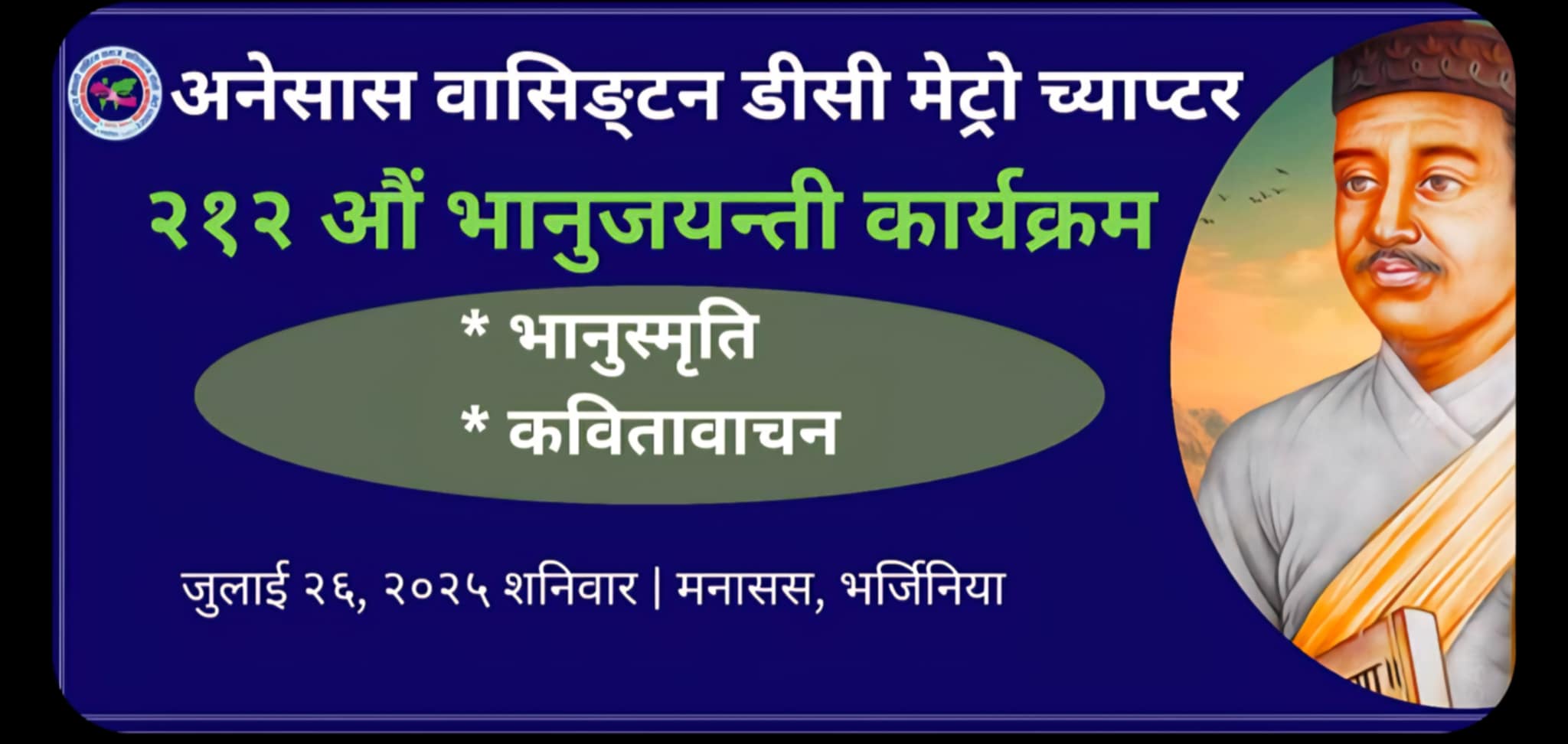 काठमाडौं । अनेसास डिसी मेट्रो च्याप्टरले २१२औं भानुजयन्तीको अवसरमा जुलाई २६ मा विविध कार्यक्रम गरी मनाएको छ। मनाससको सेन्ट्रल लाइब्रेरीमा भानुको साहित्यिक योगदानको स्मरण, कवितावाचन र कृति लोकार्पण गरी कार्यक्रम मनाइएको हो।