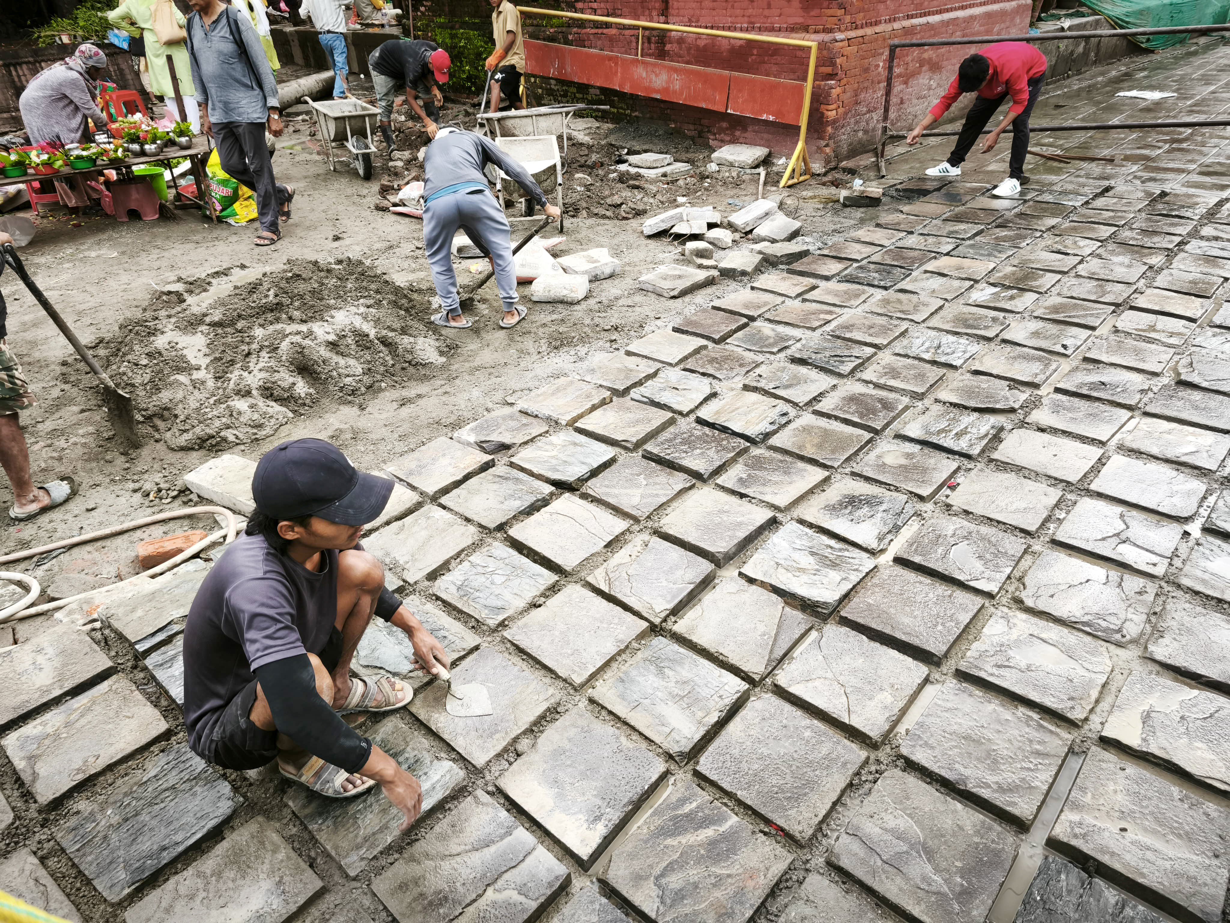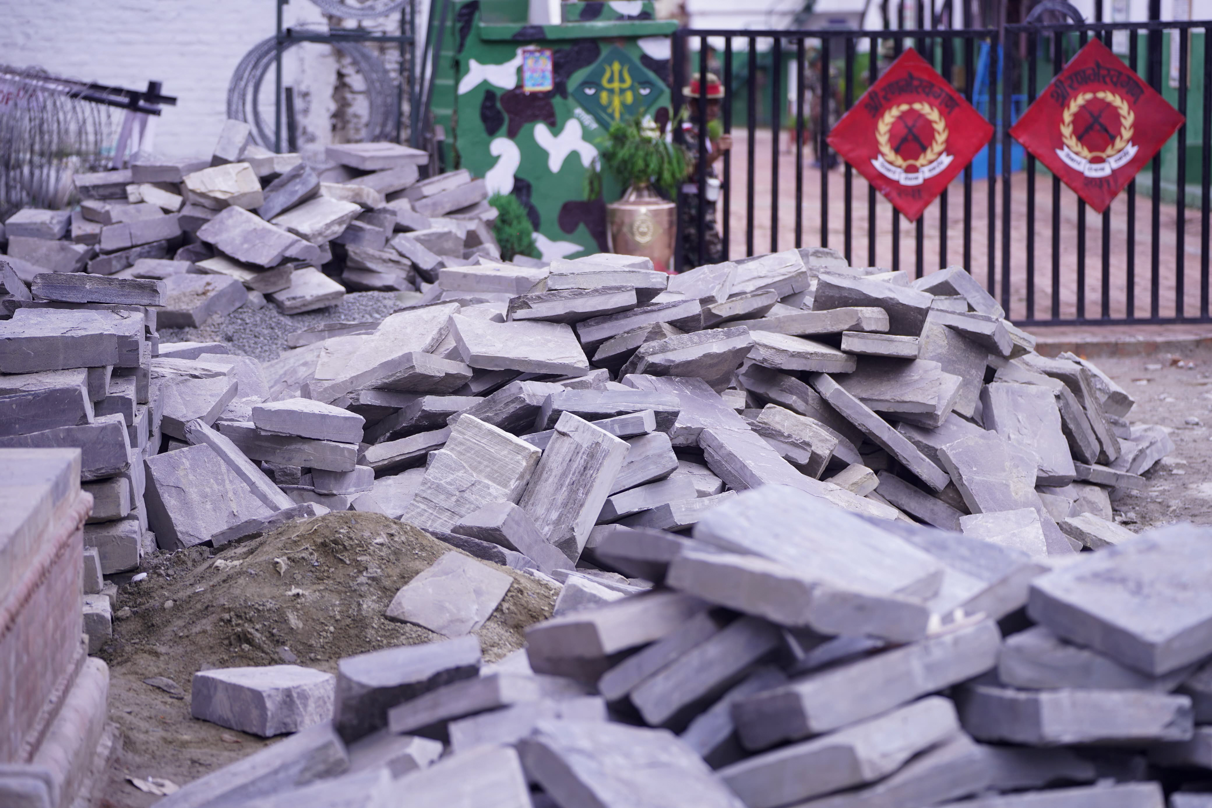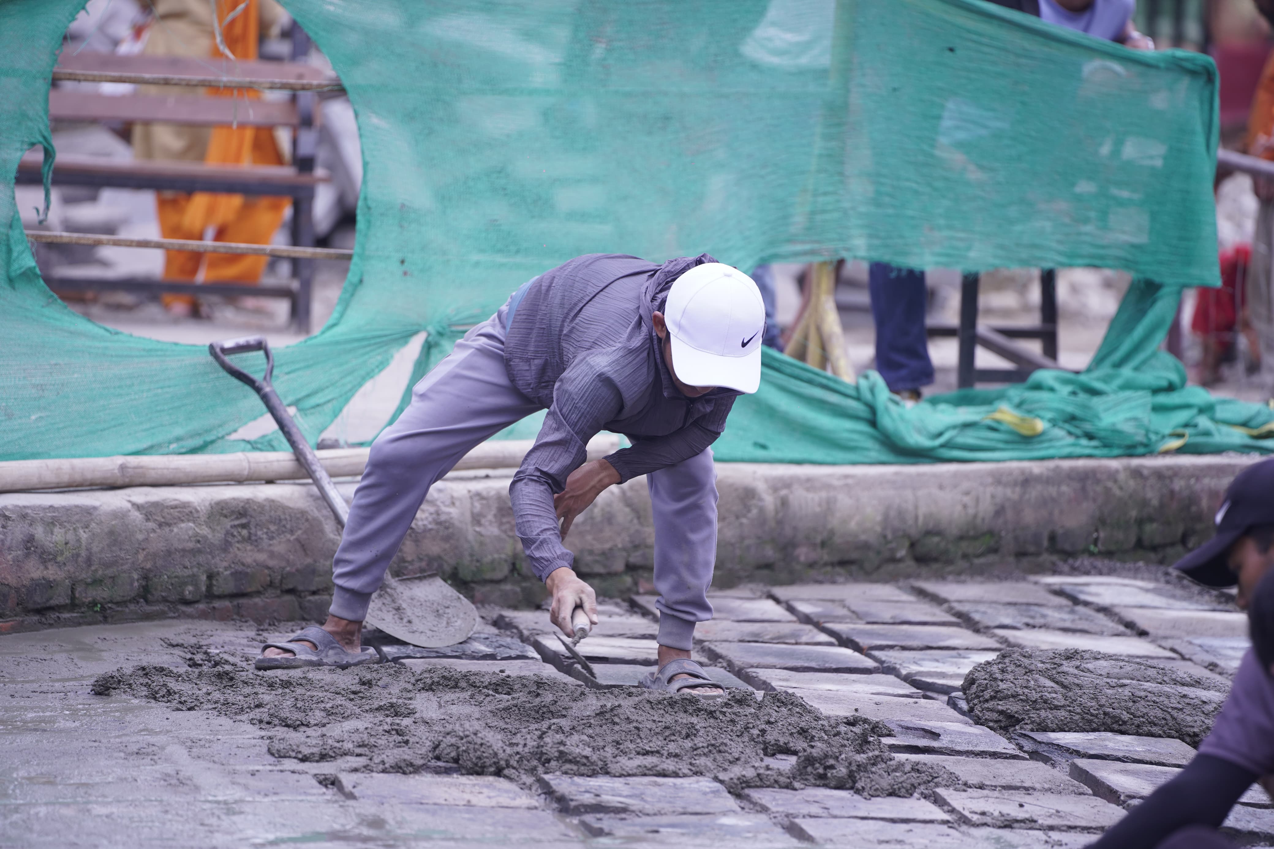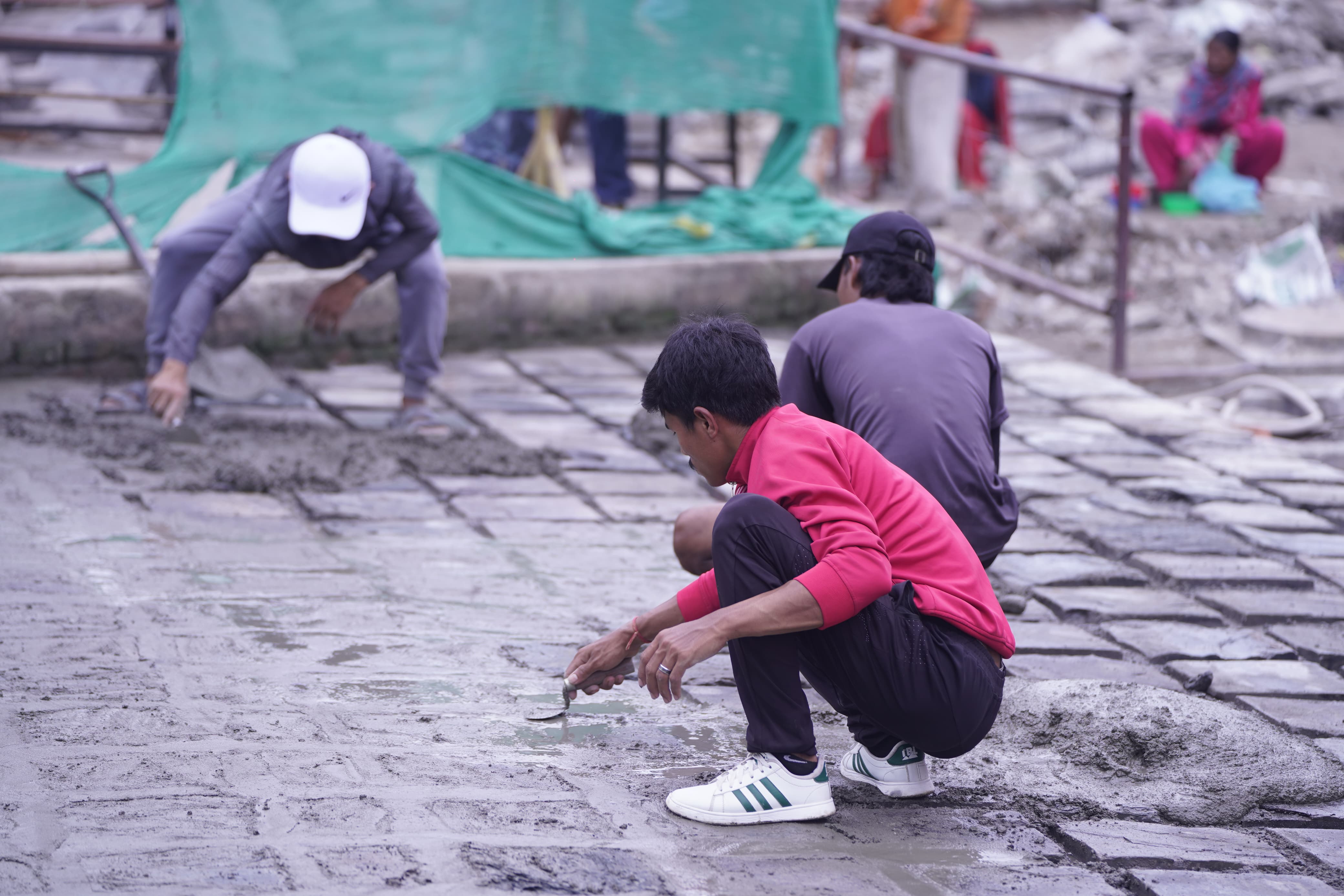 बसन्तपुर दरबार स्क्वायर प्रवेशद्वारमा ढुंगा छाप्ने काम गर्दै महानगर (तस्विरहरू)