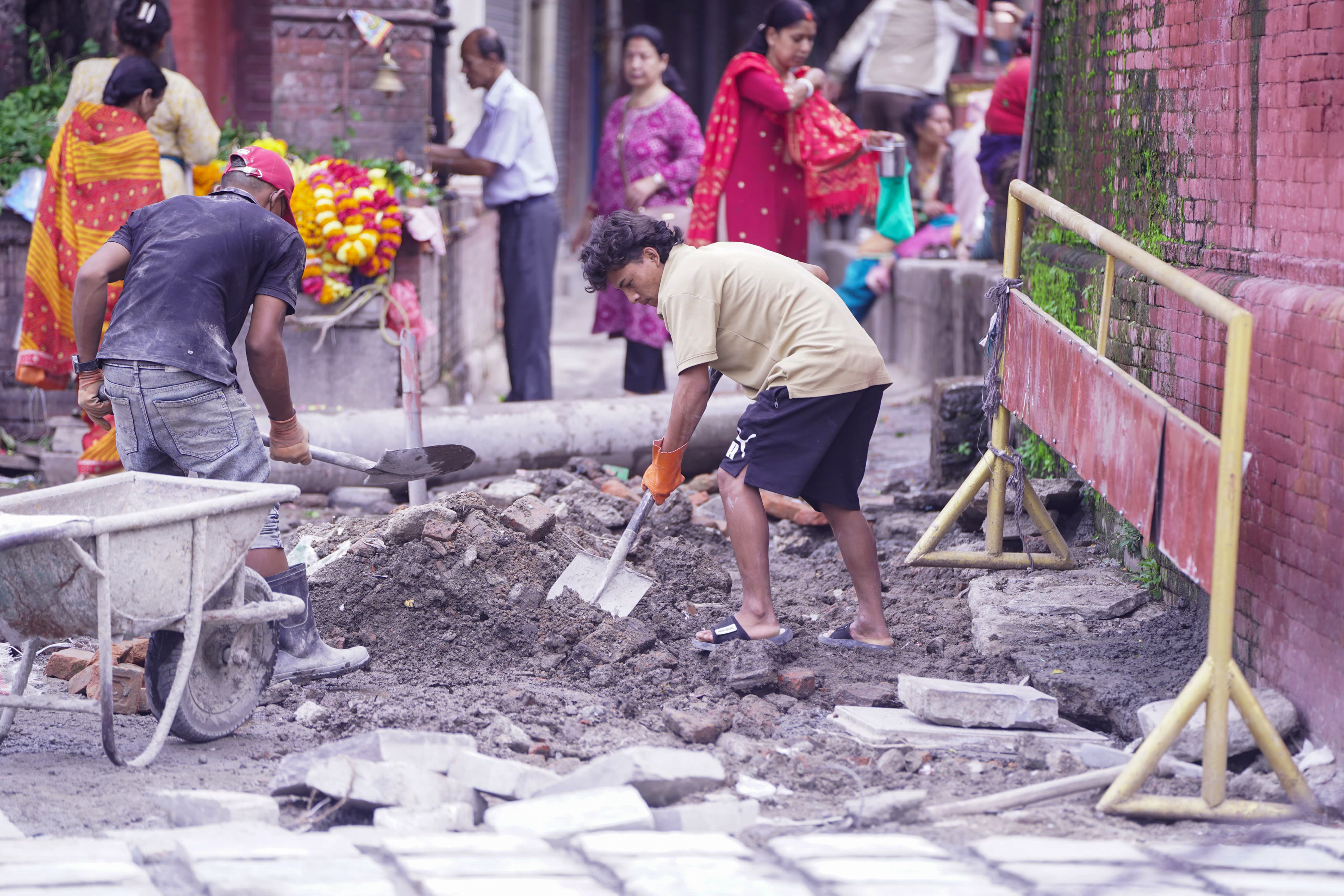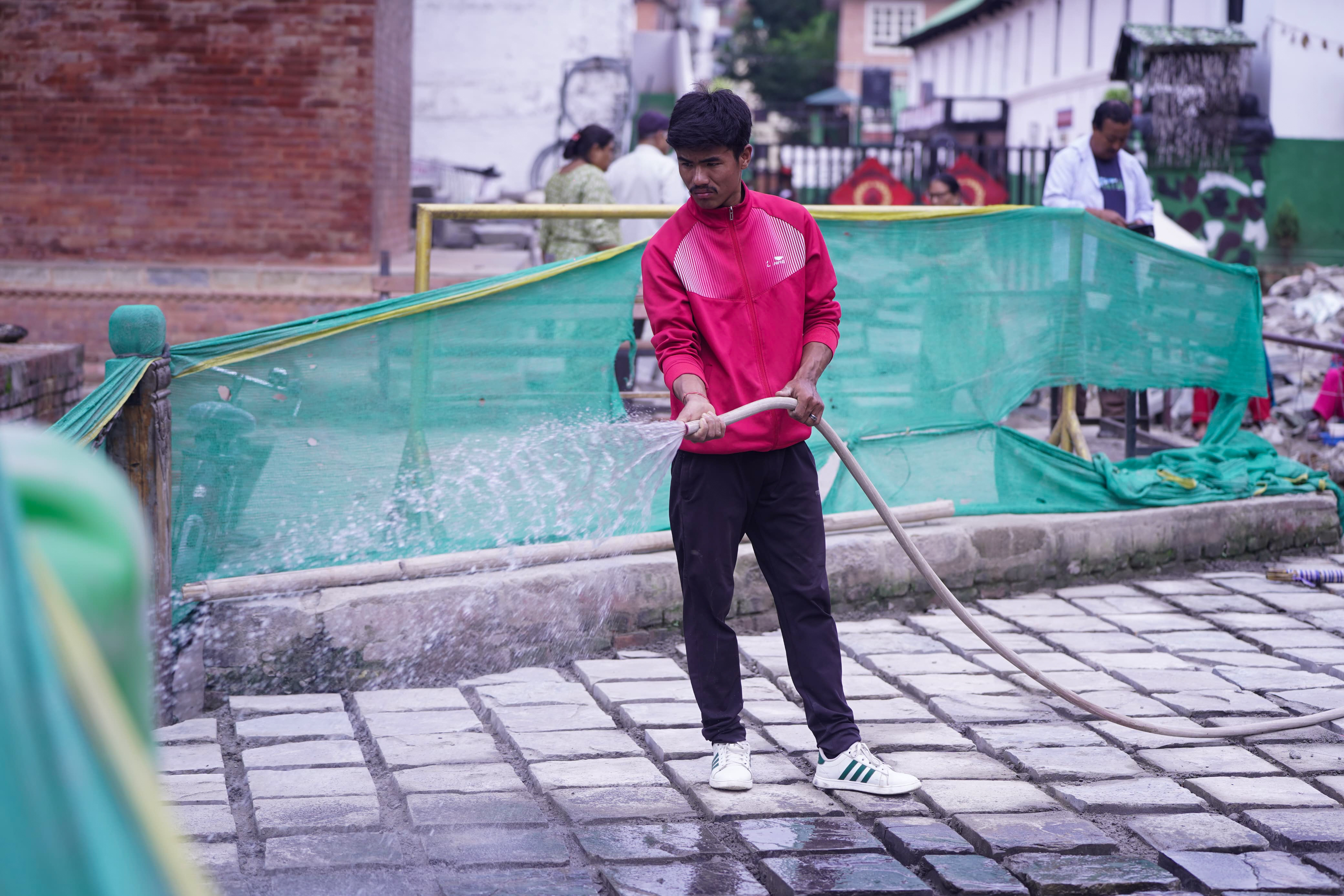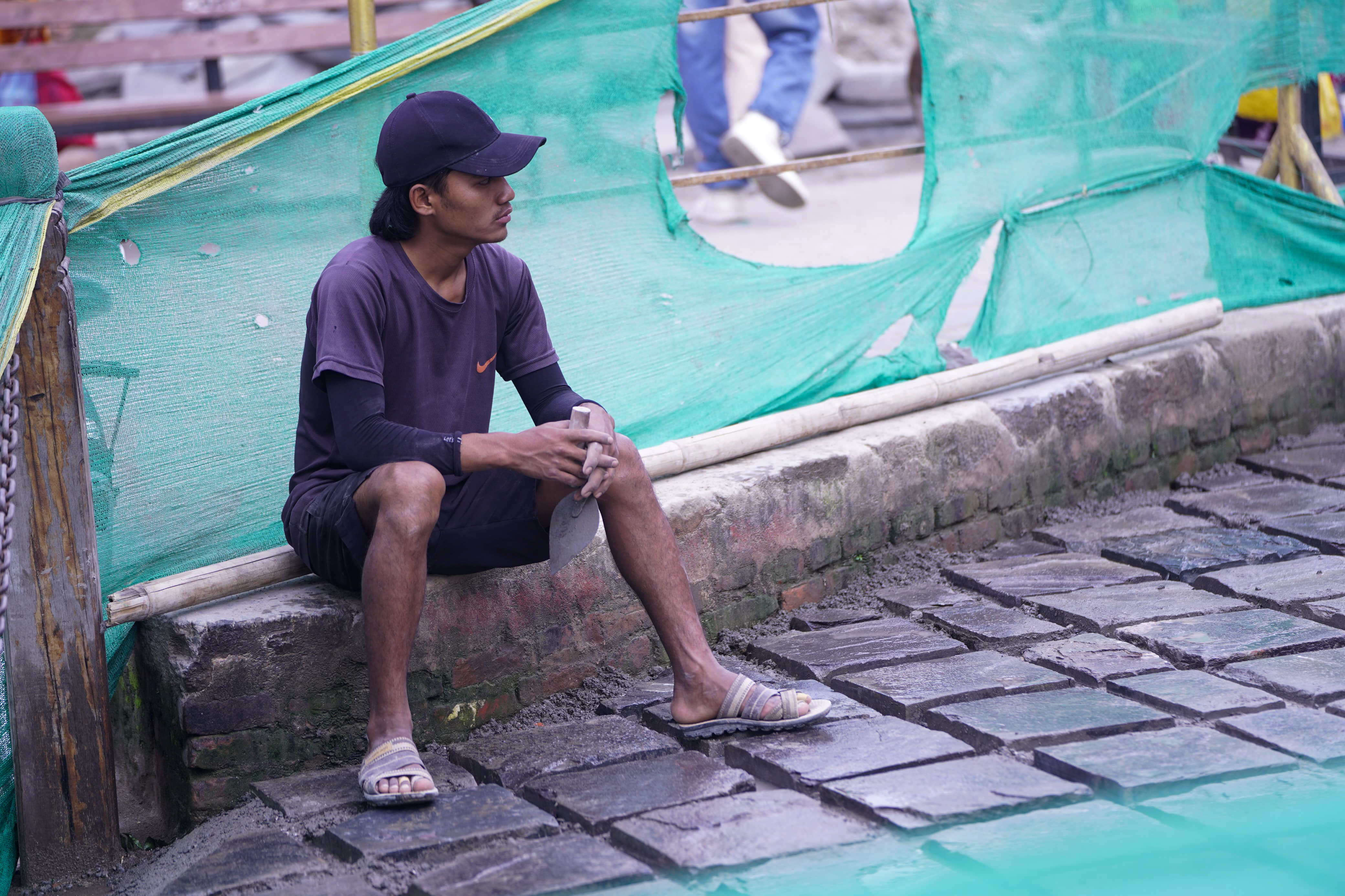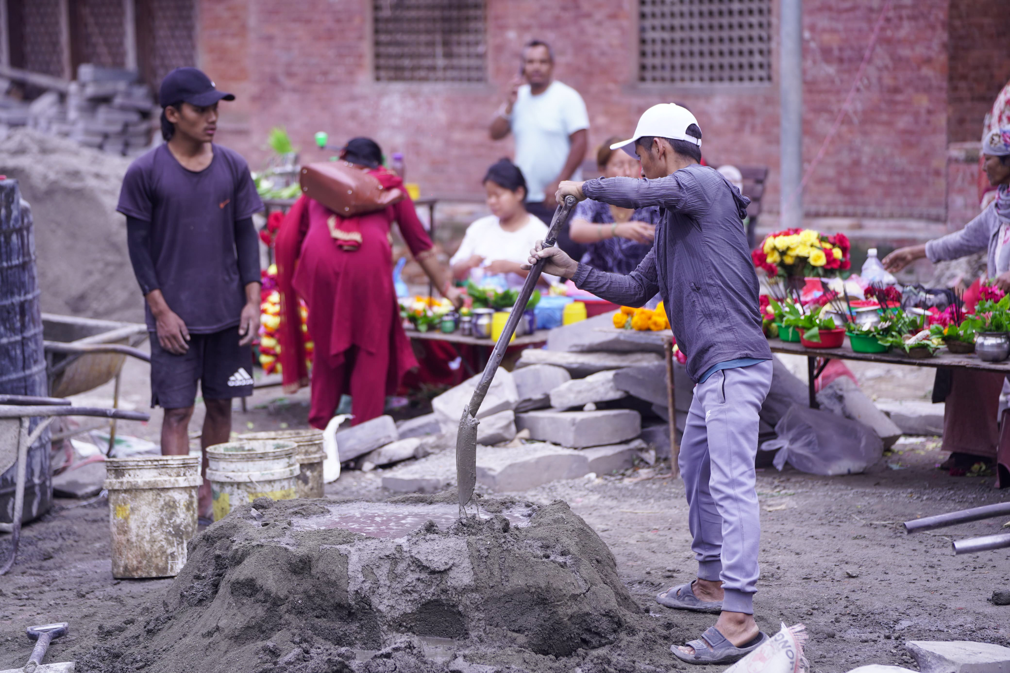 बसन्तपुर दरबार स्क्वायर प्रवेशद्वारमा ढुंगा छाप्ने काम गर्दै महानगर (तस्विरहरू)