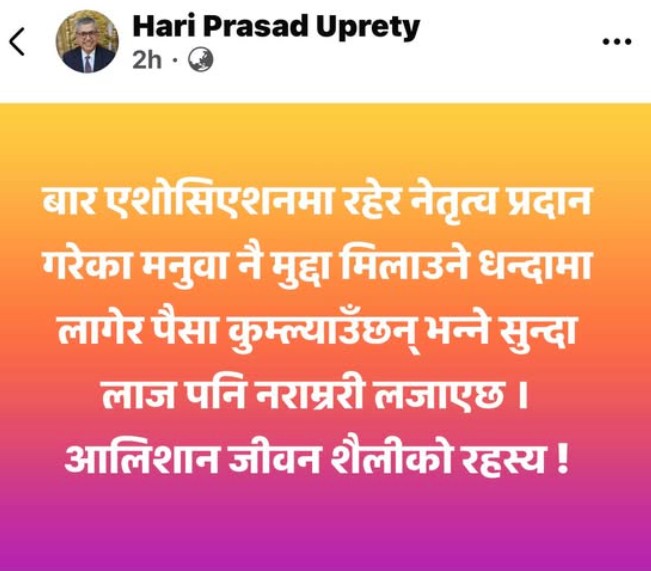काठमाडौं। वरिष्ठ अधिवक्ता हरिप्रसाद उप्रेती केही दिन अगाडि सामाजिक सञ्जाल फेसबुकमा गम्भीर विषय उठाए। उनले बारको नेतृत्वमा पुगेकाहरुले नै मुद्दा मिलाउने धन्दामा लागेर पैसा कमाउने गरेको आरोपसमेत लगाएका छन्।