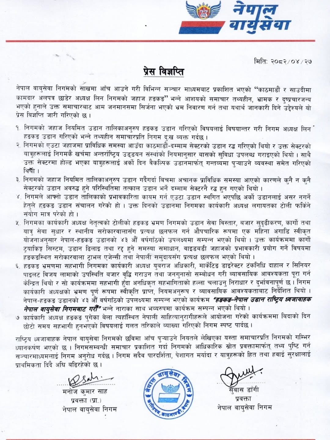 निगमले मंगलबार विज्ञप्ति गर्दै नियमित उडान तालिकाअनुसार हङकङ उडान भएको भए पनि त्यसलाई विषयान्तर गरी गलत ढंगले प्रस्तुत गरिएकोमा दुःख प्रकट गरेको छ।