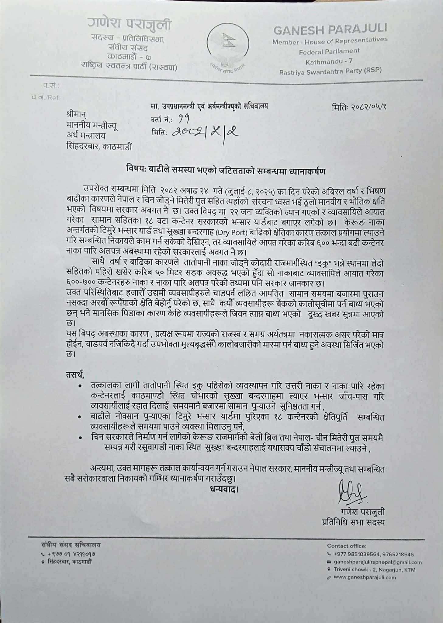 उनीहरुले केही समय अगाडि रसुवामा आएको भीषण बाढीले मितेरीपुलसमेत बगाएपछि चीनसँगको सम्बन्ध बिच्छेद भएको जनाएका छन्। यसैगरी तातोापानी नाकामा पनि ठूला सवारी साधन चल्न कठिनाइ हुँदा चीनबाट आउने सामान ल्याउन समस्या भइरहेको छ।