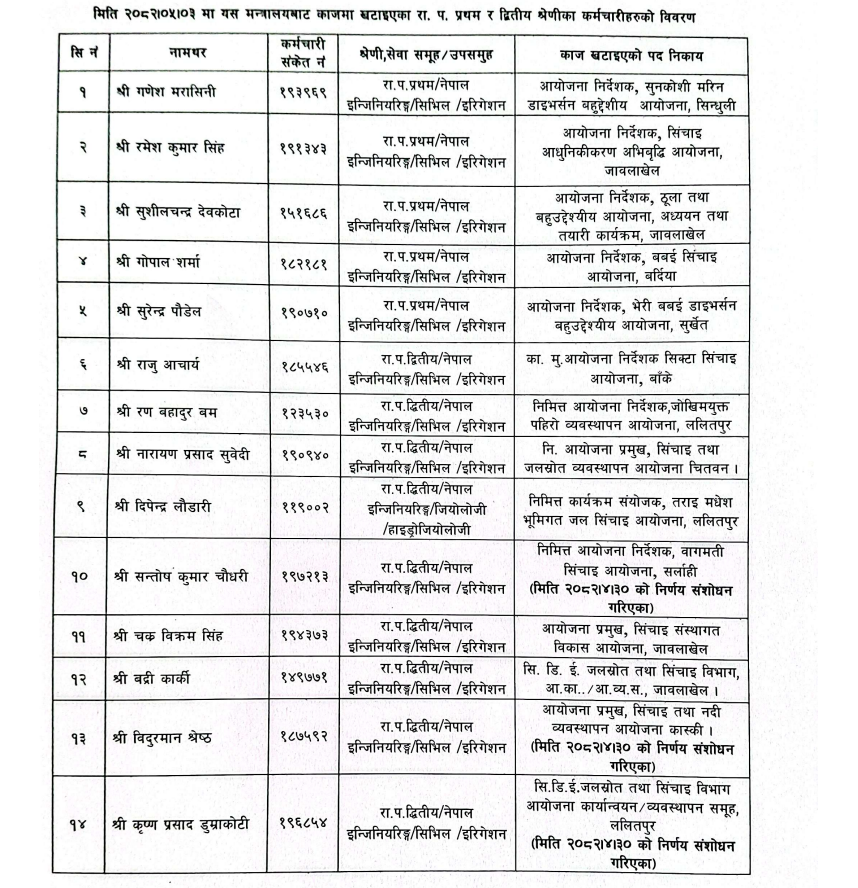 ऊर्जा, जलस्रोत तथा सिँचाइ मन्त्रालयले मातहत कार्यरत राजपत्रांकित प्रथम तथा द्वितीय श्रेणीका कर्मचारीको सरुवा गरिएको हो।