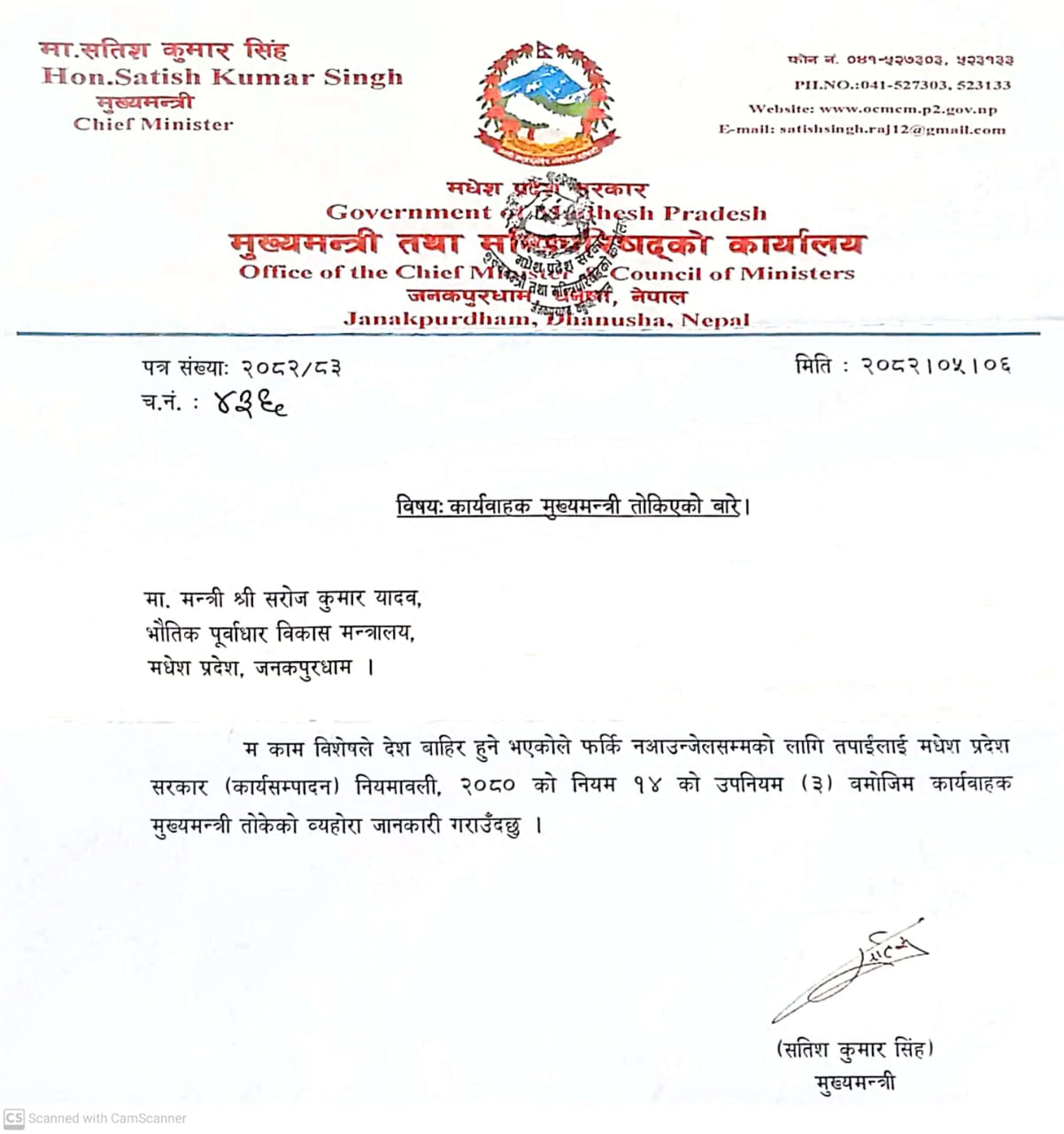 मुख्यमन्त्री तथा मन्त्रिपरिषदको कार्यालयले मधेश प्रदेश सरकार (कार्यसम्पादन) नियमावली, २०८० को नियम १४ को उपनियम (३) बमोजिम सरोज कुमार यादवलाई कार्यवाहक मुख्यमन्त्रीको जिम्मेवारी दिएको पत्रमार्फत जानकारी गराएको छ।