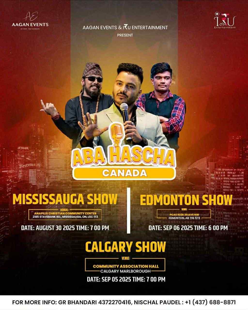 अगस्ट ३० मा मिसिसाउगा शो र सेप्टेम्बर ६ मा एडमन्टन शो हुने छ। ती कार्यक्रममा भरतमणिले पूर्वयुवराज पारस शाहको अभिनय गर्ने छ्न्। कैलाशले भिखारी र सुमन कार्कीले स्ट्यान्ड अप कमेडी गर्ने बताइएको छ।