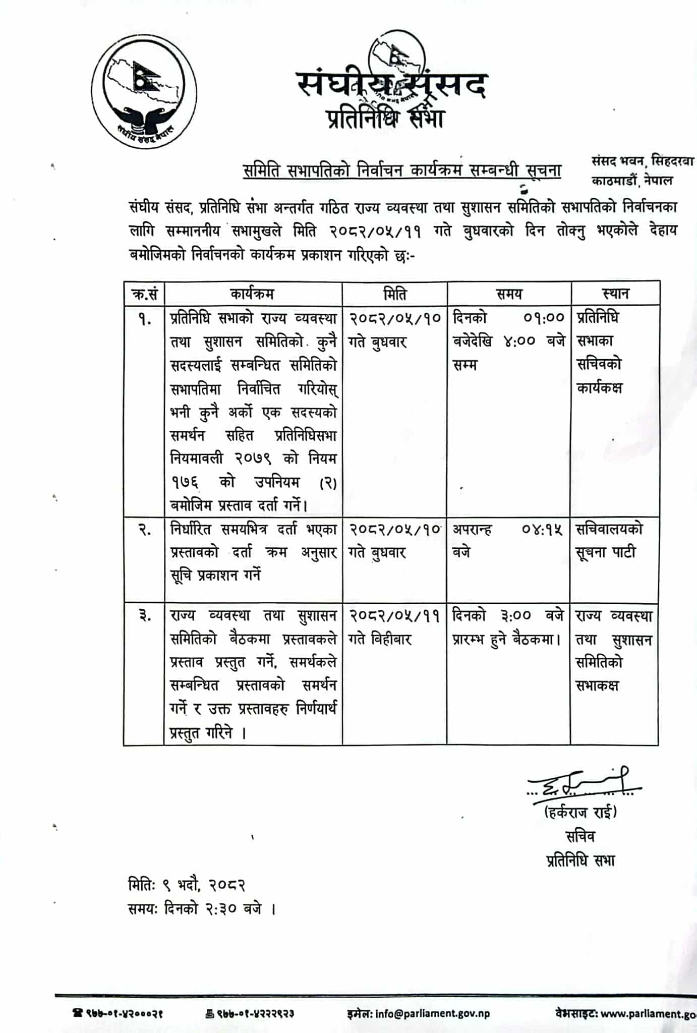 राज्य व्यवस्था समितिको सभापतिको निर्वाचन तालिका सार्वजनिक