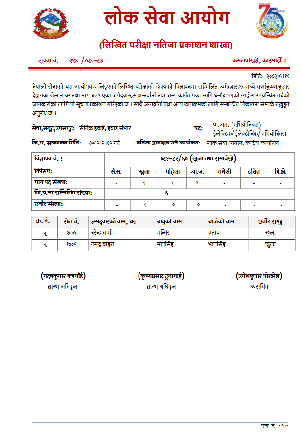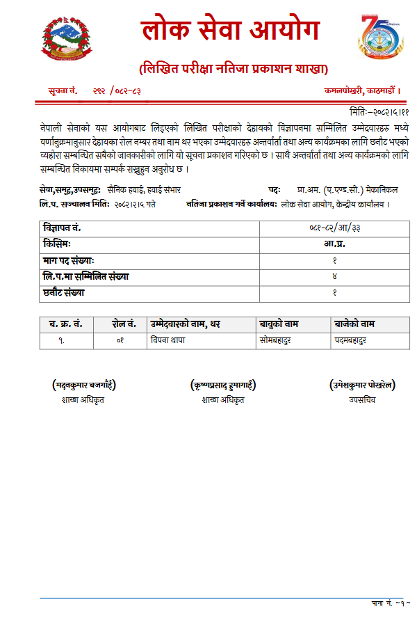 काठमाडौं । लोकसेवा आयोगले नेपाली सेनाको लिखित परीक्षाको नतिजा प्रकाशित गरेको छ।