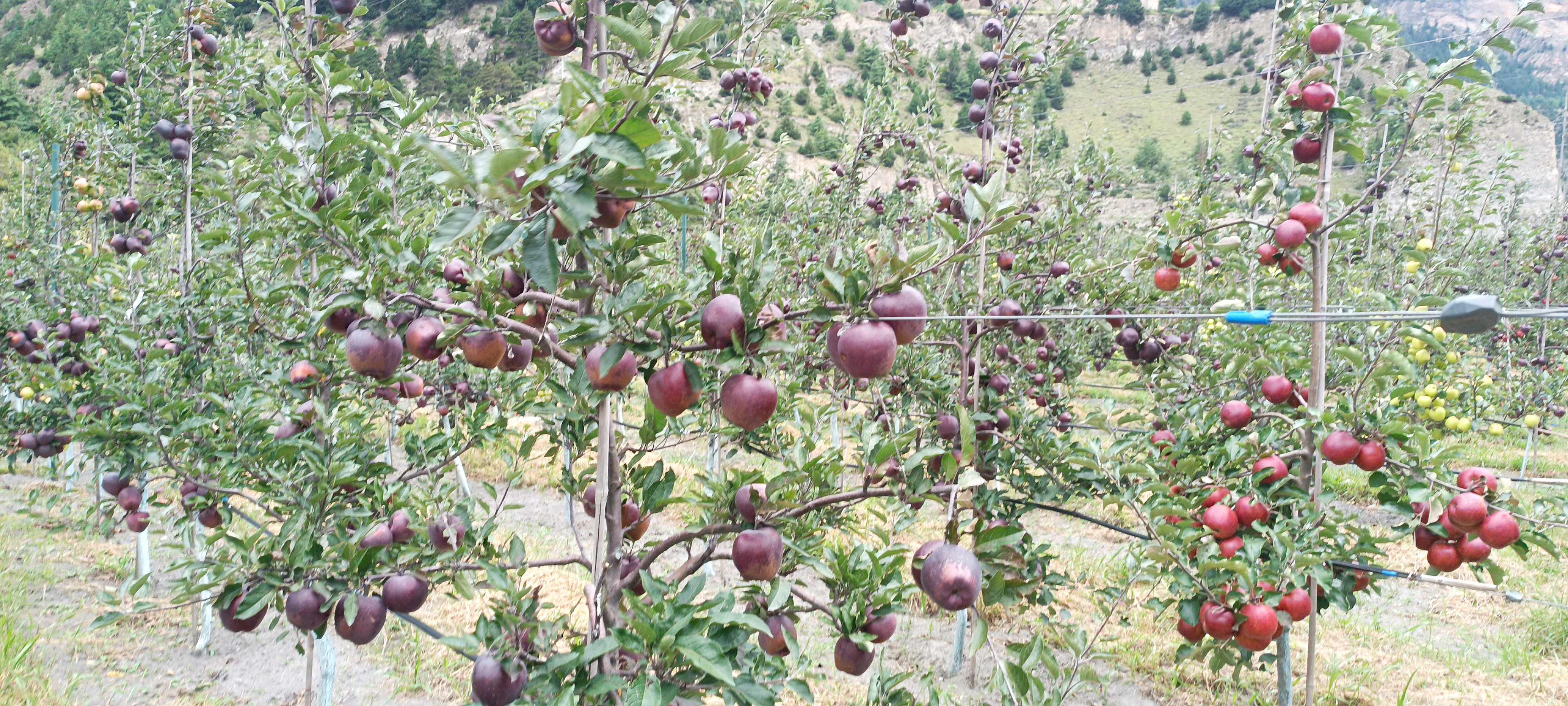 मुस्ताङको थासाङ गाउँपालिका-१ टुकुचे गाउँका किसान निरज तुलाचनको आइ.पी.एम. एप्पल फार्ममा लटरम्म फलेको टिप्ने बेला भएको स्याउ । उहाँको बगैँचामा उच्च घनत्वमा उत्पादन हुने गाला, फुजी, किङरड जातका स्याउ यतिबेला व्यापारीले बगैँचा मै प्रतिकेजी रु २५० तिरेर किन्ने गरेका छन् ।