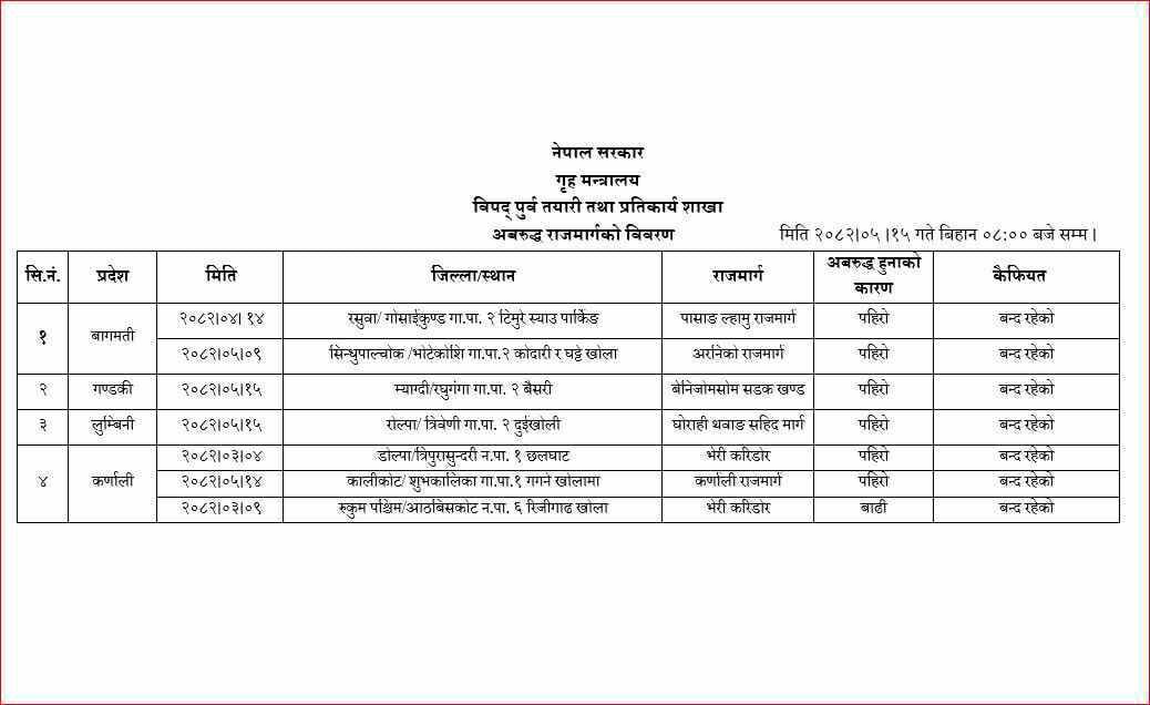 हाल पासाङ ल्हामु राजमार्ग अन्तर्गत रसुवा गोसाइकुण्ड गाउँपालिका २ टिमुरे,अरनीको राजमार्गअन्तर्गत भोटेकोशी गाउँपालिका-२कोदारी र घट्टेखोला, बेनिजोमसोम सडक खण्ड अन्तर्गत रघुगंगा गाउँपालिका दुई खोलीमा सडक अवरुद्ध छ । त्यस्तै, घोराही थवाङ शहिद मार्गअन्तर्गत त्रिवेणी गाउँपालिका, भेरि करिडोरअन्तर्गत त्रिपुरासुन्दरी नगरपालिका छलघाट,कर्णाली राजमार्गअन्तर्गत शुभकालिन गाउँपालिका र भेरि करिडोर अन्तर्गत आठविसकोट नगरपालिकामा सडक अवरुद्ध छ।