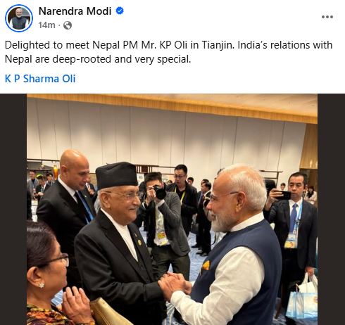 मोदी आफ्नो आधिकारिक सामाजिक सञ्जाल एक्समा उनले ओलीसँगको तस्बिर हाल्दै लेखेका छन्, ‘नेपालका प्रधानमन्त्री केपी ओलीसँग तियान्जिनमा भेट भएकोमा अत्यन्तै हर्षित छु। भारत-नेपालको सम्बन्ध चिरस्थायी एवम् अत्यन्तै विशेष रहेको छ।’