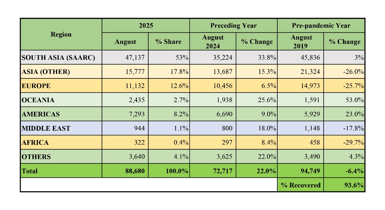 सन् २०२५ को जनवरीदेखि अगस्तसम्म आठ महिनाको अवधिमा सात लाख ३६ हजार ५६२ पर्यटक भित्रिएका छन् । बोर्डले सार्वजनिक गरेको तथ्यांकअनुसार क्षेत्रगत रुपमा हेर्दा दक्षिण एसियाली (सार्क) मुलुकबाट ४७ हजार १३७ पर्यटक अर्थात् ५३ प्रतिशत आगमन भएको देखिन्छ भने एसियाका अन्य मुलुकमा १५ हजार ७७७ अर्थात् १७.८ प्रतिशत, युरोपबाट ११ हजार १३२ अर्थात् १२.६ प्रतिशत र ओसनियाबाट दुई हजार ४३५ अर्थात् २.७ प्रतिशत पर्यटक भित्रिएका छन्।
