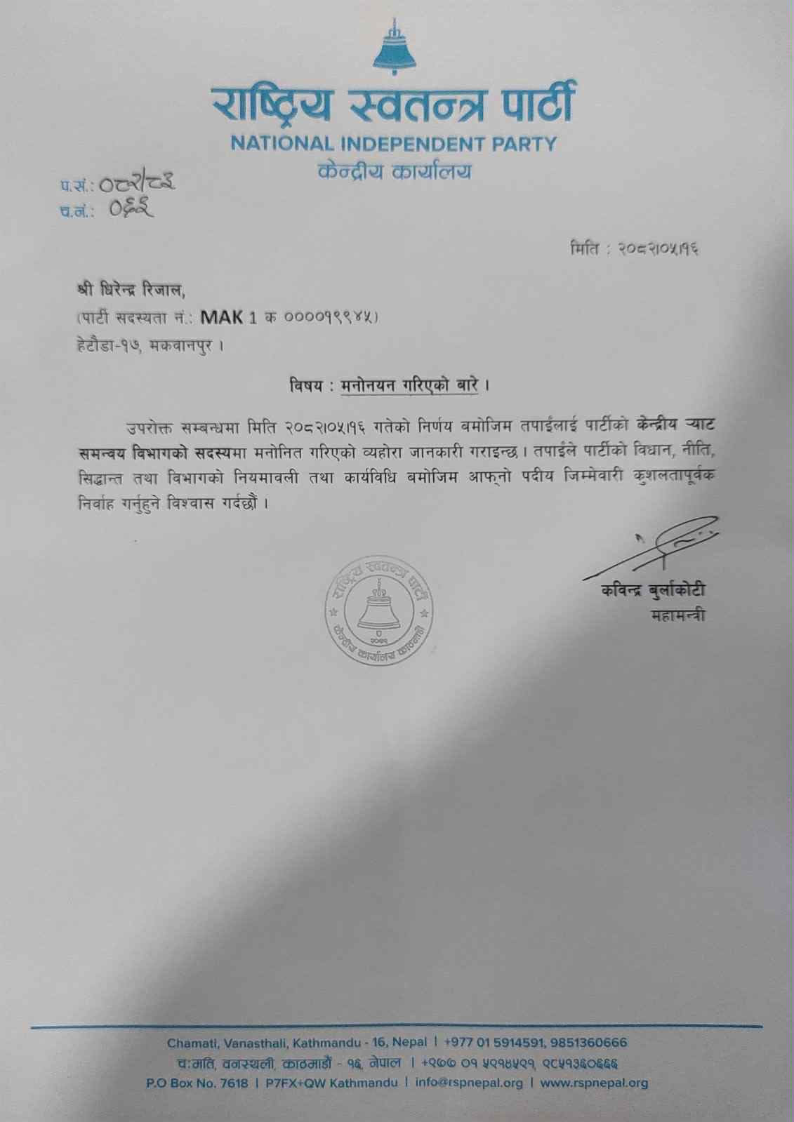 पार्टीका कार्यवाहक सभापति डीपी अर्याल, महामन्त्री कविन्द्र बुर्लाकोटी र केन्द्रीय र्याट समन्वय विभागका प्रमुख बैकुण्ठ थापा (आशिष) को उपस्थितिमा उनीहरूलाइ मनोनित गरिएको हाे।