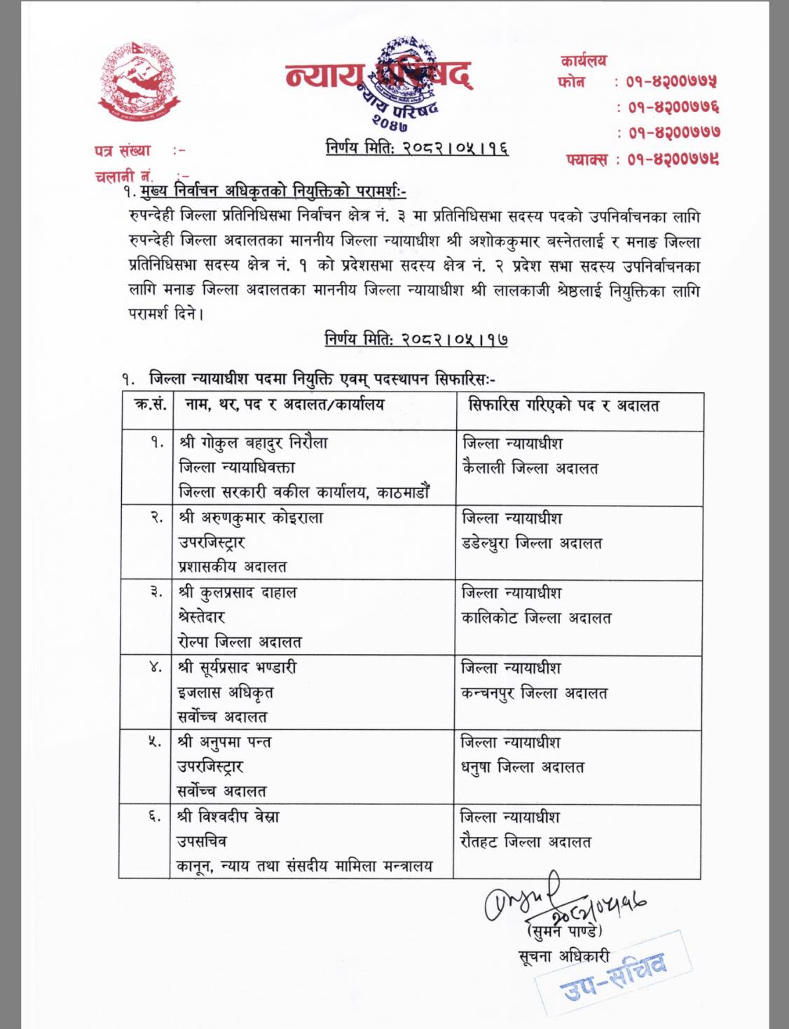 परिषद्ले चार जना न्याय सेवाका एक जना सरकारी वकिल र एक जना कानुन सेवाका अधिकृतलाई जिल्ला न्यायाधीशमा सिफारिस गरेको हो। प्रधानन्यायाधीश प्रकाशमान सिंह राउतको अध्यक्षतामा बसेको न्याय परिषद्को बैठकले जिल्ला न्यायाधिवक्ता गोकुलबहादुर निरौलालाई कैलाली, उपरजिष्ट्रार अरुणकुमार कोइरालालाई डडेलधुरा, स्रेस्तेदार कुलप्रसाद दाहाललाई कालिकोट, इजलास अधिकृत सूर्यप्रसाद भण्डारीलाई कञ्चनपुर, उपरजिष्ट्रार अनुपमा पन्तलाई धनुषा र उपसचिव विश्वदीप वेस्रालाई रौतहट जिल्ला अदालतमा नियुक्ति गर्दै पदस्थापना समेत गरेको छ।