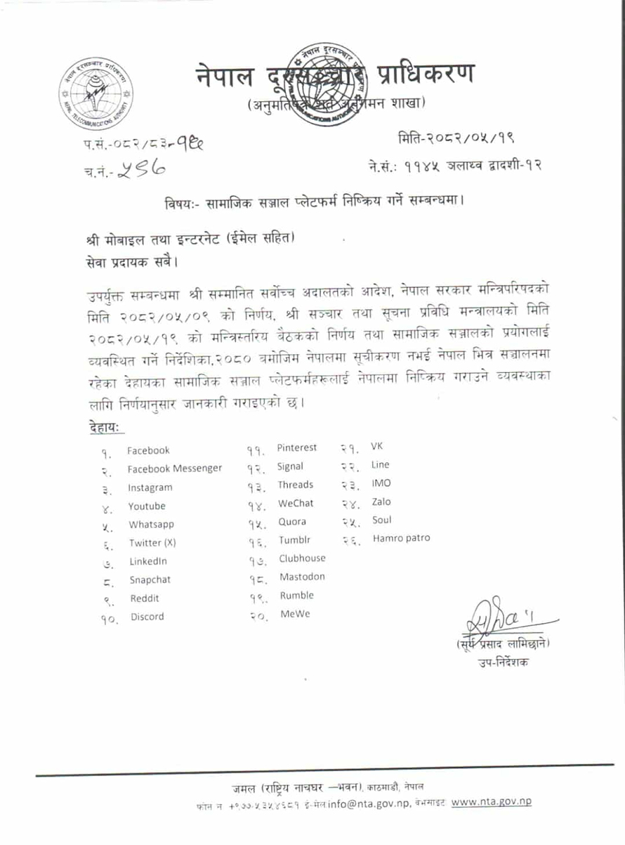 सर्वोच्च अदालतको आदेश, नेपाल सरकार मन्त्रिपरिषदको भदौ ५ गतेको निर्णय आज (बिहीबार) बसेको सञ्‍चार तथा सूचना प्रविधि मन्त्रालयको बसेको मन्त्रीस्तरीय निर्णय र सामाजिक सञ्जालको प्रयोगलाई व्‍यवस्थित गर्ने निर्देशिक, २०८० बमोजिम प्राधिकरणले सबै इन्टरनेट सेवा प्रदायकहरूलाई २६ वटा समाजिक सञ्जाललाई बन्द गर्न निर्देशन दिएको