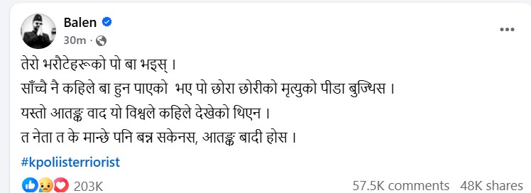 जेनजी समूहको आन्दोलनमा सरकारले गरेको रबैयाप्रति कटाक्ष गर्दै बालेनले प्रधानमन्त्री ओलीप्रति कडा रुपमा आक्रोश व्यक्त गरेका हुन् । उनले प्रधानमन्त्री ओलीलाई ‘तँ’ शब्दमा नै सम्बोधन गर्दै प्रधानमन्त्री ओलीलाई आतंकवादीको संज्ञा दिएका छन् ।