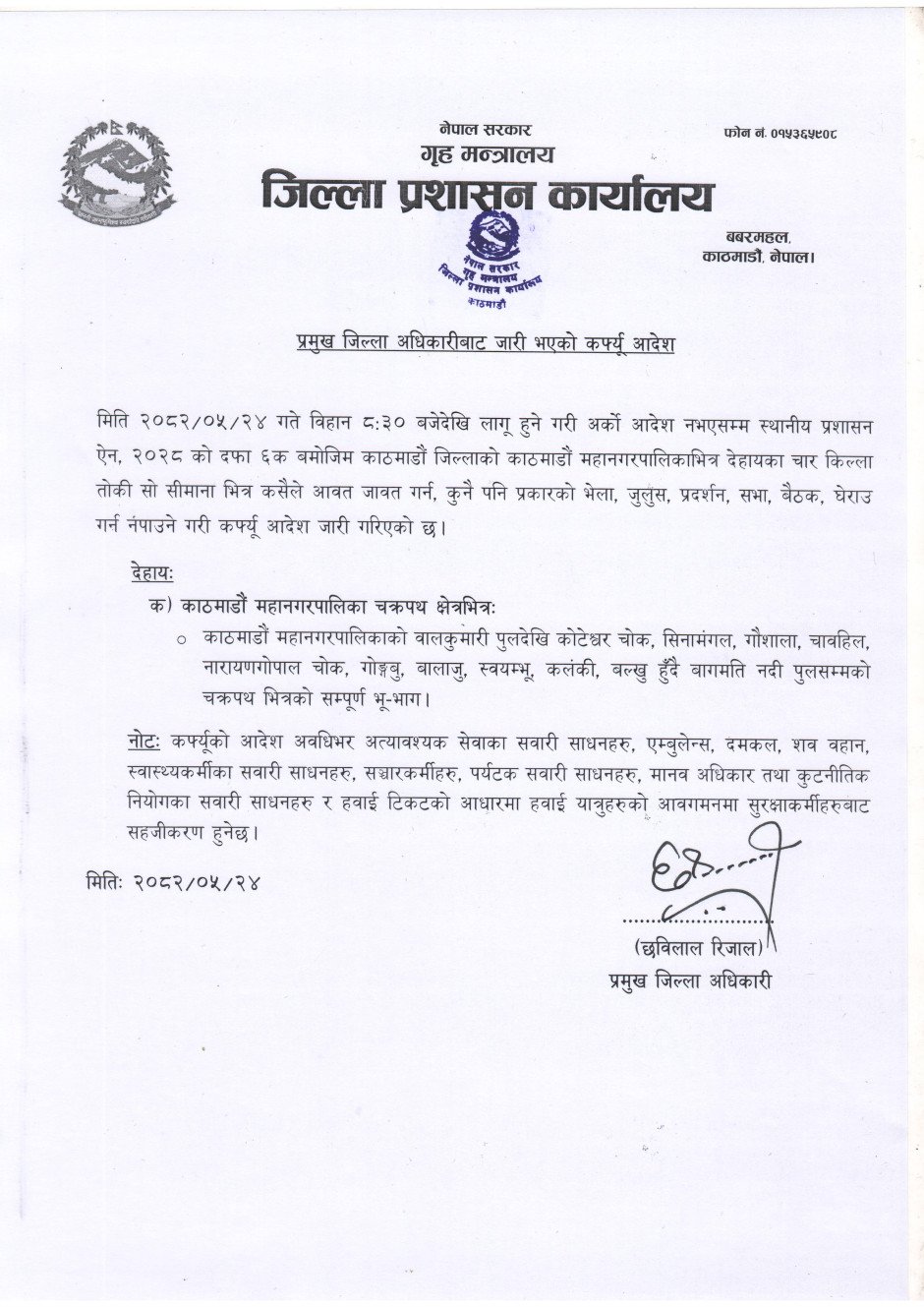 काठमाडौं । काठमाडौंमा कर्फ्यू आदेश जारी भएको छ। जिल्ला प्रशासन कार्यालय काठमाडौँले मंगलबार बिहान साढे ८ बजेदेखि अर्को आदेश नभएसम्म काठमाडौं महानगरको चक्रपथ क्षेत्र भित्र कर्फ्यू आदेश जारी गरेको छ।