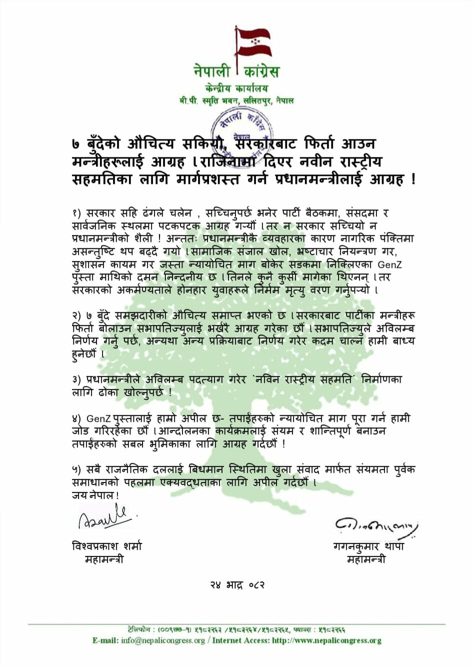 मंगलबार विज्ञप्ति जारी गर्दै उनीहरूले नेकपा एमालेसँग भएको सात बुँदे सहमतिको औचित्य समाप्त भएको घोषणा गर्दै कांग्रेसका मन्त्रीहरूलाई फिर्ता बोलाएका हुन्।