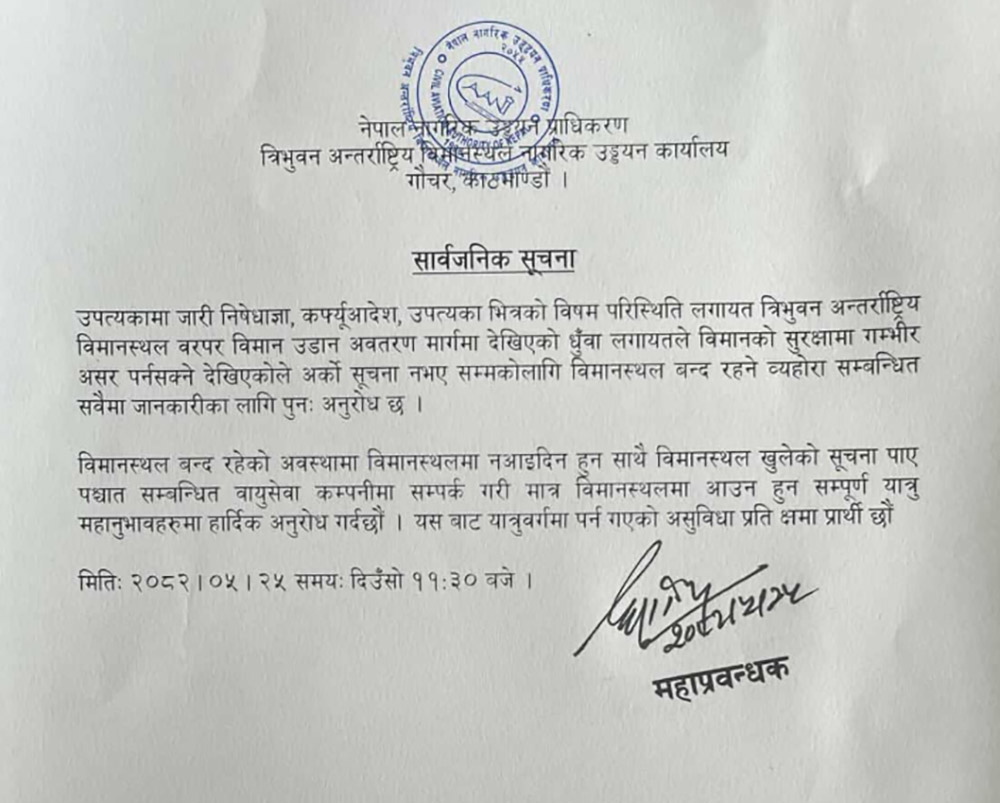 त्रिभुवन अन्तर्राष्ट्रिय विमानस्थल कार्यालयले सुचना प्रकाशित गर्दै देशभर निषेधाज्ञा र कर्फ्यू जारी भएका कारण उपत्यका भित्र विषम परिस्थितिले विमानस्थल वरपर विमान उडान अवतरण मार्गमा देखिएको धुँवा लगायतले विमानको सुरक्षामा गम्भीर असरपर्न सक्ने भएकाले अर्को सूचना नभएसम्म विमानस्थल बन्द रहने जानकारी गराएको छ।