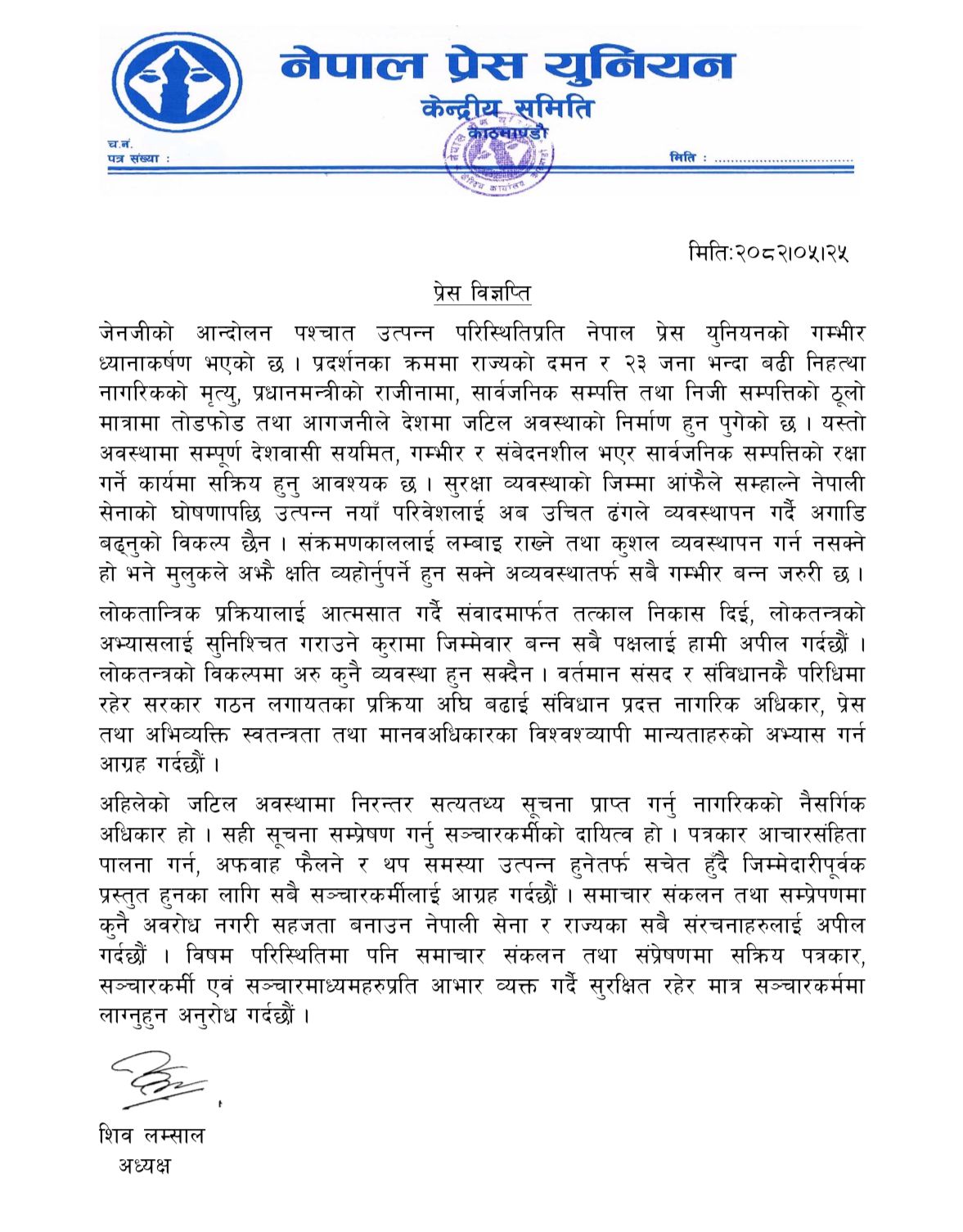 जेनजीको आन्दोलनपछि उत्पन्न जटिल परिस्थितिप्रति गम्भीर चिन्ता व्यक्त गर्दै नेपाल प्रेस युनियनका केन्द्रीय अध्यक्ष शिव लम्सालले जारी गरेको विज्ञप्तिमा आन्दोलनका क्रममा भएको राज्यको दमन, २३ जनाभन्दा बढी निहत्था नागरिकको मृत्यु, प्रधानमन्त्रीको राजीनामा, र सार्वजनिक तथा निजी सम्पत्तिको व्यापक तोडफोडले देश संकटपूर्ण अवस्थामा पुगेको उल्लेख छ।