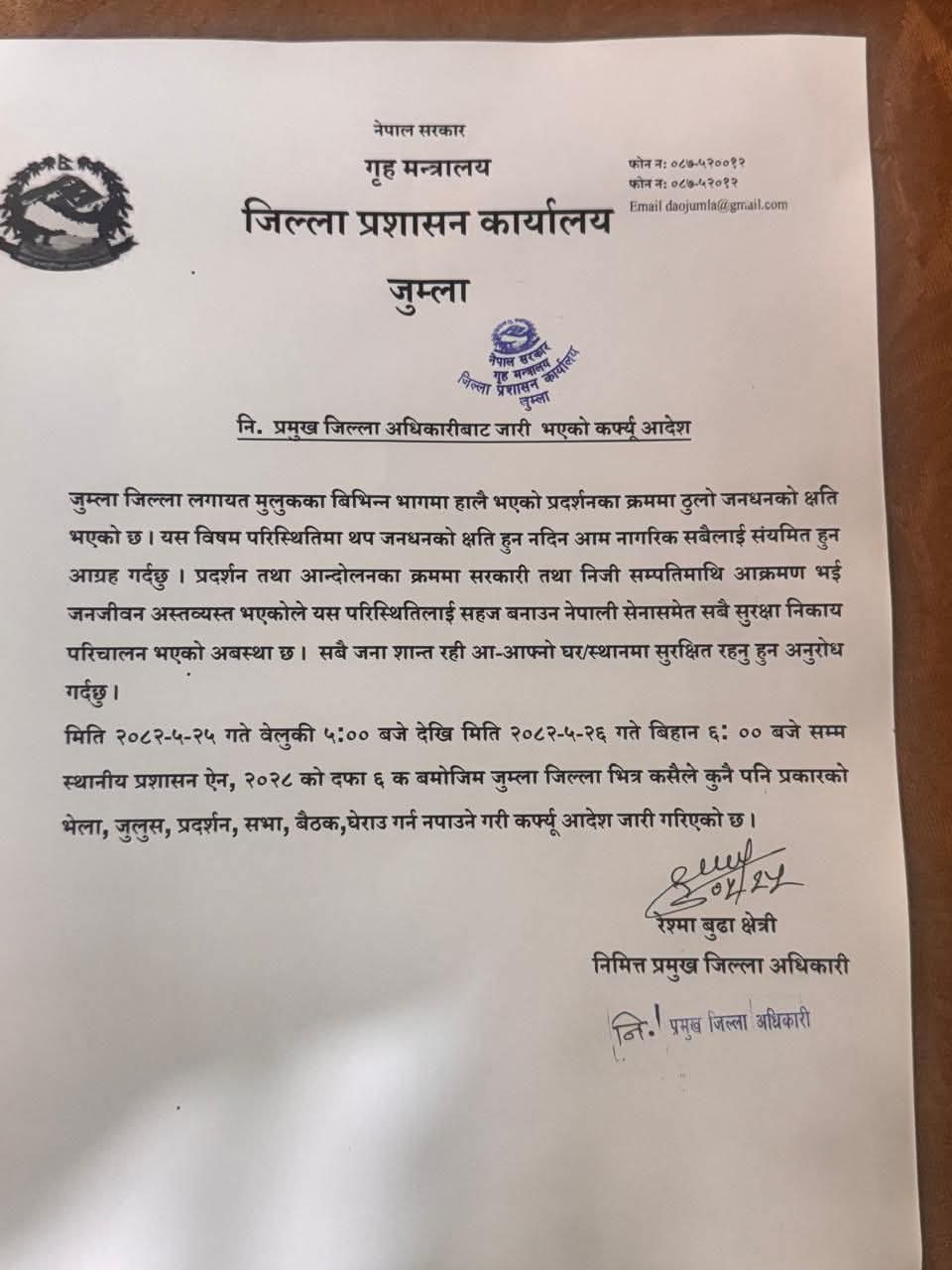 कार्यलयले २०८२-५-२५ गते बेलुकी ५ः०० बजे देखि मिति २०८२-५-२६ गते बिहान ६ः०० बजे सम्म स्थानीय प्रशासन ऐन, २०२८ को दफा ६ क बमोजिम जुम्ला जिल्ला भित्र कसैले कुनै पनि प्रकारको भेला, जुलुस, प्रदर्शन, सभा, बैठक, घेराउ गर्न नपाउने समेत बताएको छ।
