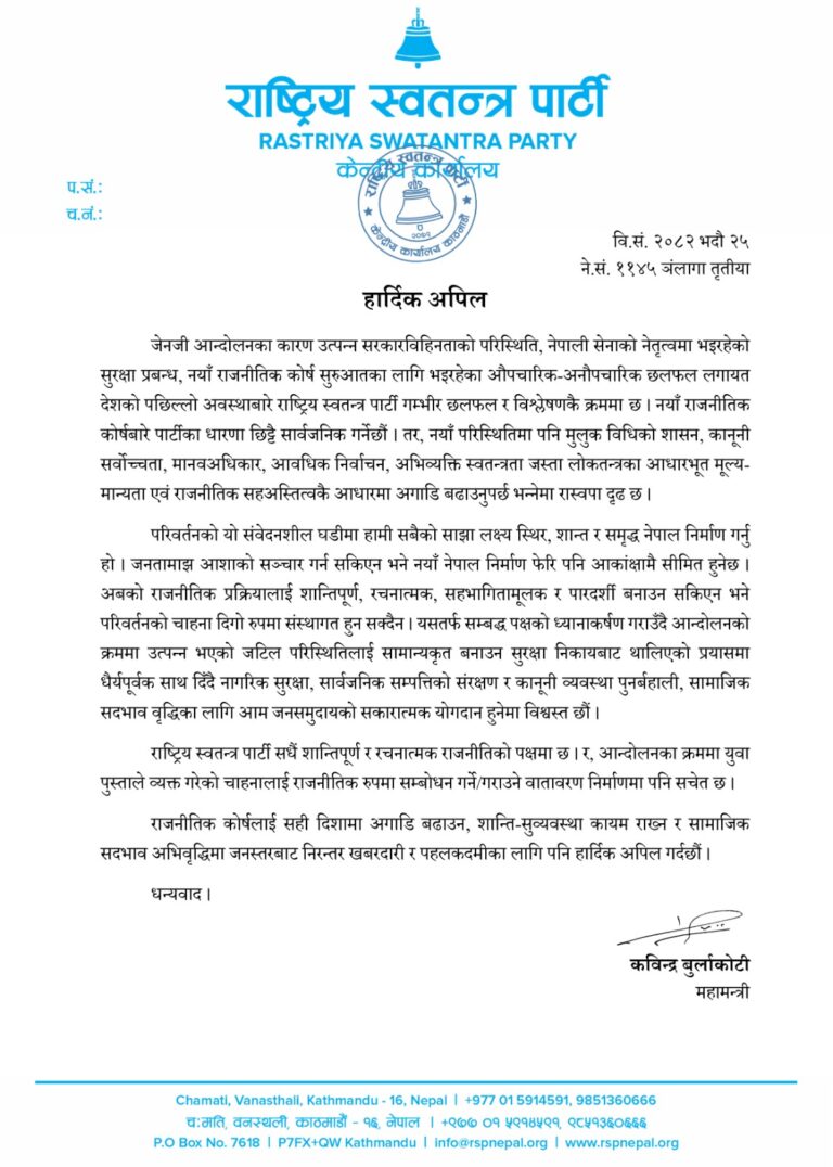 सो दलको तर्फबाट महामन्त्री कबिन्द्र बुर्लाकोटीले आज एक विज्ञप्ति जारी गर्दै जेन जी पुस्ताको आन्दोलनका क्रममा युवा पुस्ताले व्यक्त गरेको चाहनालाई राजनीतिक रुपमा सम्बोधन गर्ने र गराउने वातावरण निर्माणमा पनि रास्वपा सचेत रहेको उल्लेख गरेका छन्।