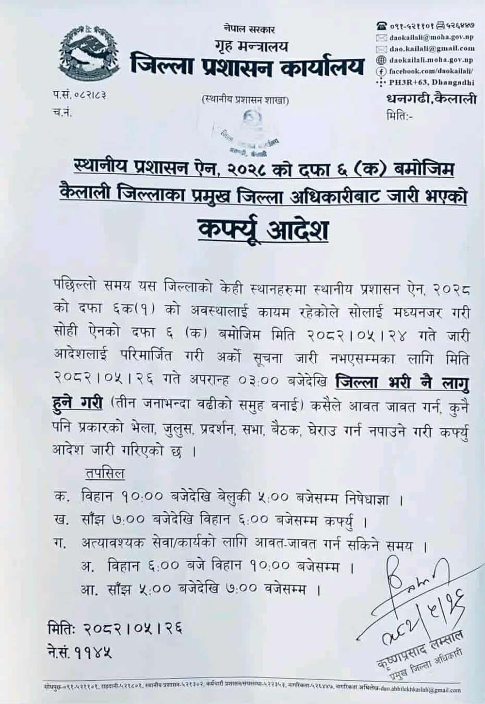 धनगढी । कैलाली जिल्ला प्रशासन कार्यालयले जिल्लाभर नै कर्फ्यु आदेश जारी गरेको छ।