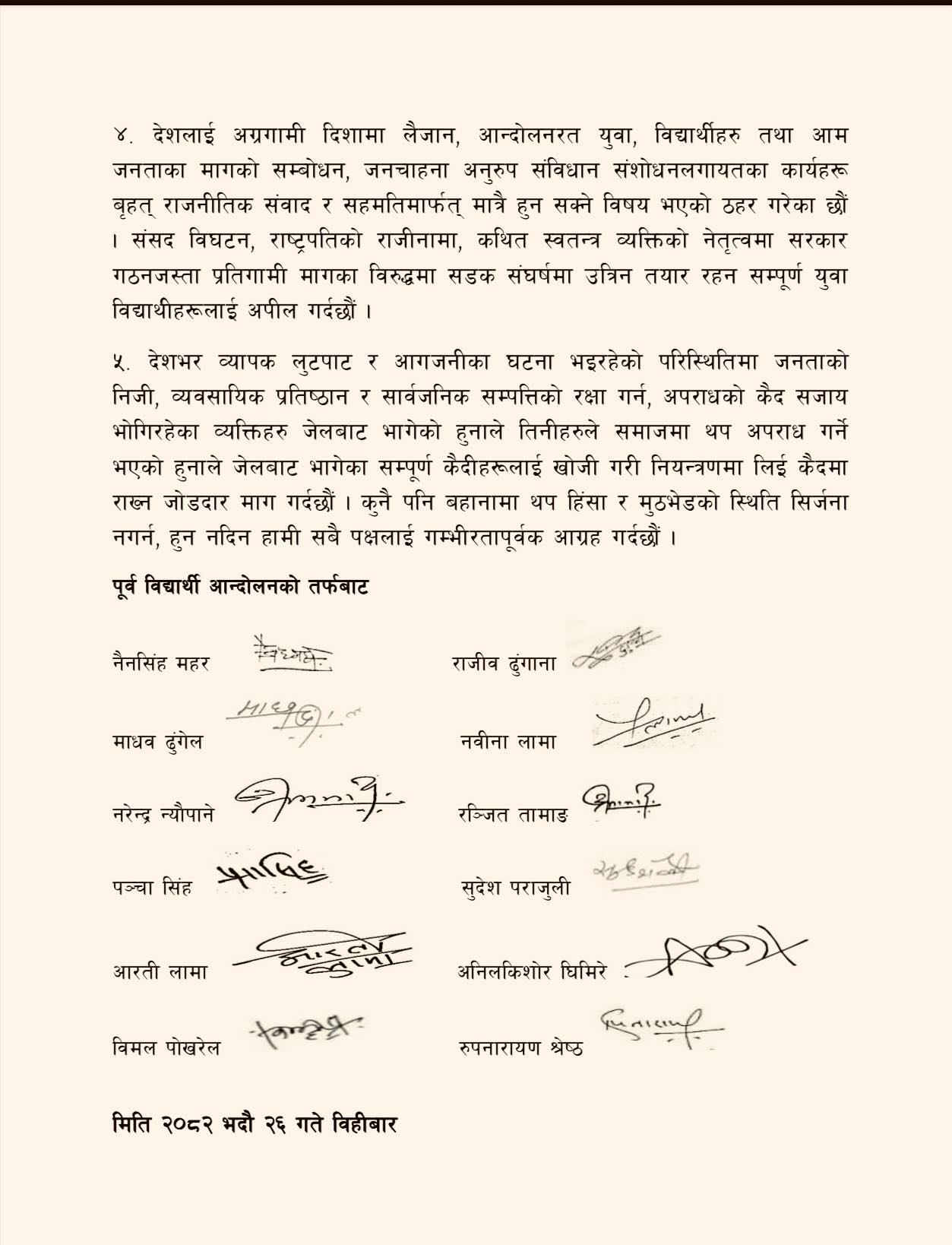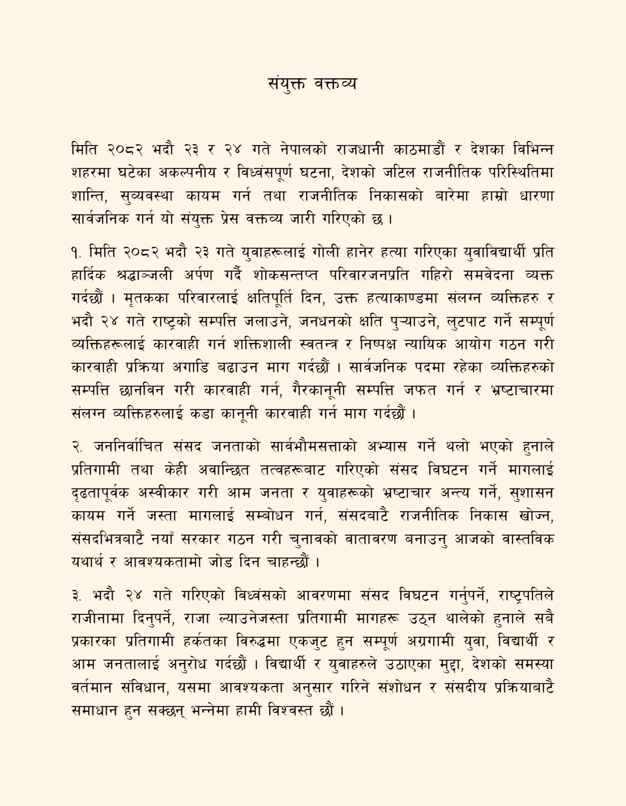 विज्ञप्तिमा भनिएको छ, ‘देशलाई अग्रगामी दिशामा लैजान, आन्दोलनरत युवा, विद्यार्थीहरु तथा आम जनताका मागको सम्बोधन, जनचाहनाअनुरुप संविधान संशोधनलगायतका कार्यहरू बृहत् राजनीतिक संवाद र सहमतिमार्फत मात्रै हुन सक्ने विषय भएको ठहर गरेका छौँ।’