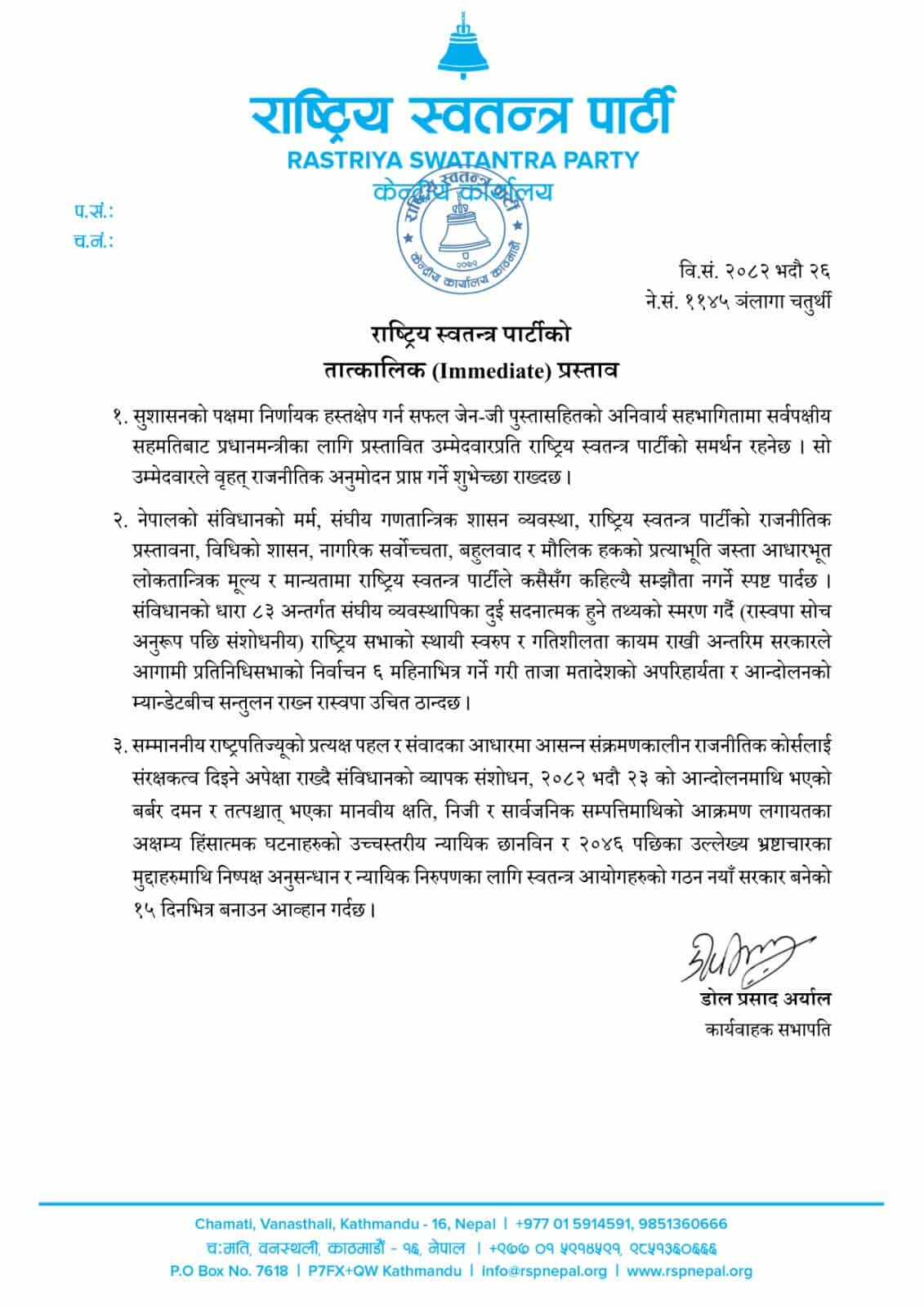 रास्वपाले आज तीन बुँदे तात्कालीन प्रस्ताव जारी गर्दै नेपालको संविधानको मर्म, संघीय गणतान्त्रिक शासन व्यवस्था, विधिको शासन, नागरिक सर्वोच्चता, बहुलवाद र मौलिक हकको प्रत्याभूति जस्ता आधारभूत लोकतान्त्रिक मूल्य र मान्यता कसैसँग कहिल्यै सम्झौना नगर्ने स्पष्ट पारेको हो।