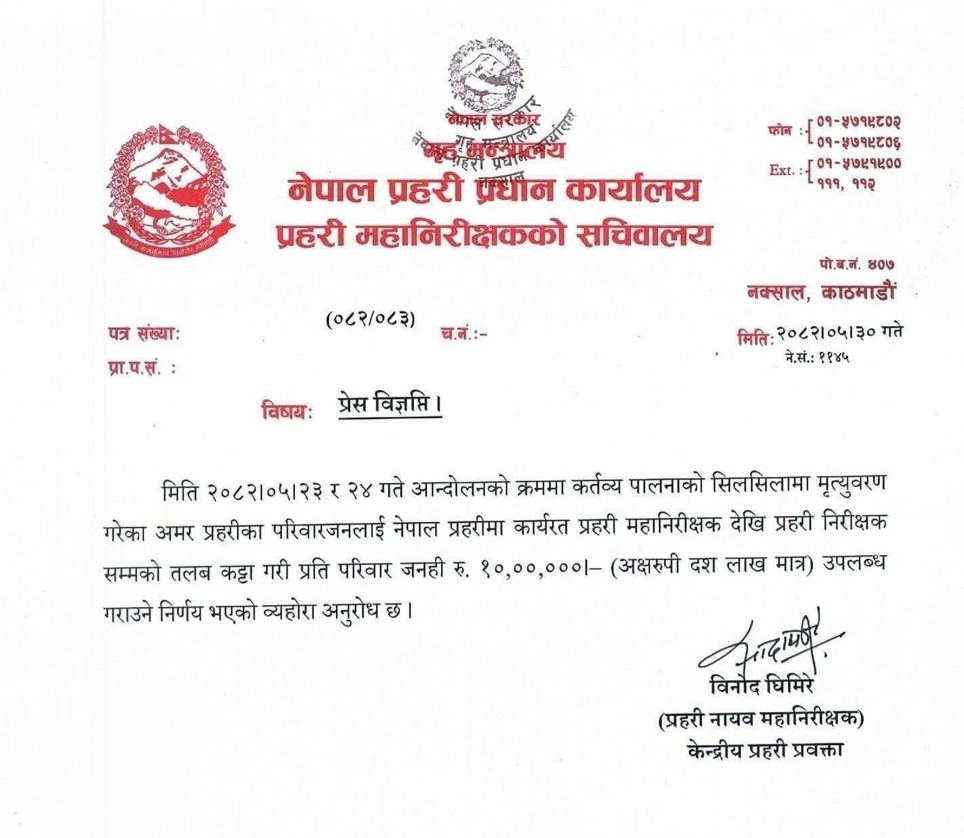 आन्दोलनमा मारिने सुरक्षाकर्मीहरु पनि थिए तर उनीहरुबारे कार्की सरकारले कुनै निर्णय नगरेपछि नेपाल प्रहरीले भने आफूभित्रैबाट रकम संकलन गरेर भए पनि मृतक प्रहरीका परिवारलाई राहत दिने घोषणा गरेको छ। र, यसबारे सरकारले जस्तै विज्ञप्ति नै निकाले प्रहरीले अमर प्रहरीका परिवारलाई १० लाख दिने घोषणा गरेको हो।