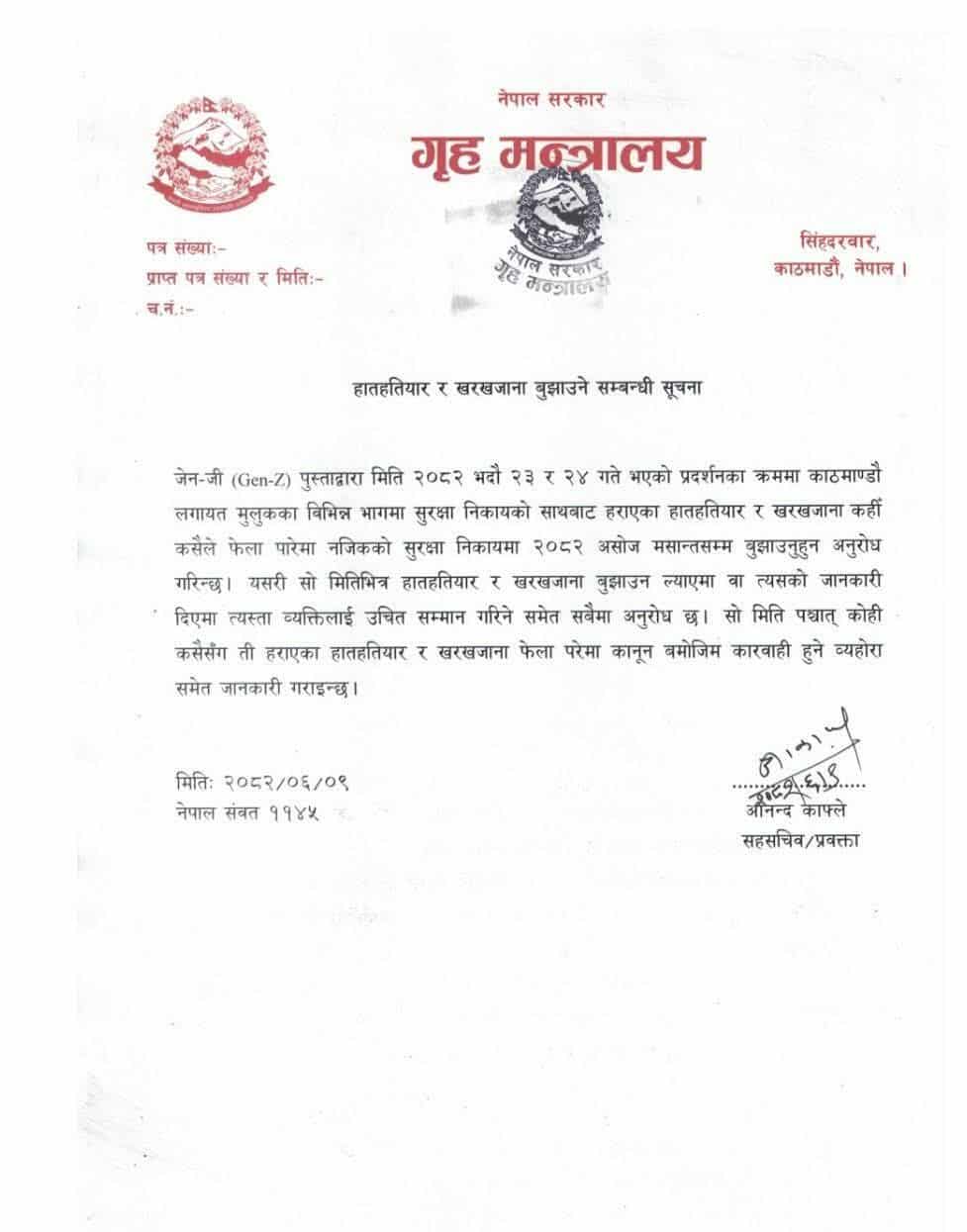 काठमाडौं गृह मन्त्रालयले जेनजी आन्दोलनका क्रममा हराएका हातहतियार र खरखजाना फेला परेमा आगामी असोज मसान्तभित्र नजिकैको सुरक्षा निकायमा बुझाउन आग्रह गरेको छ।