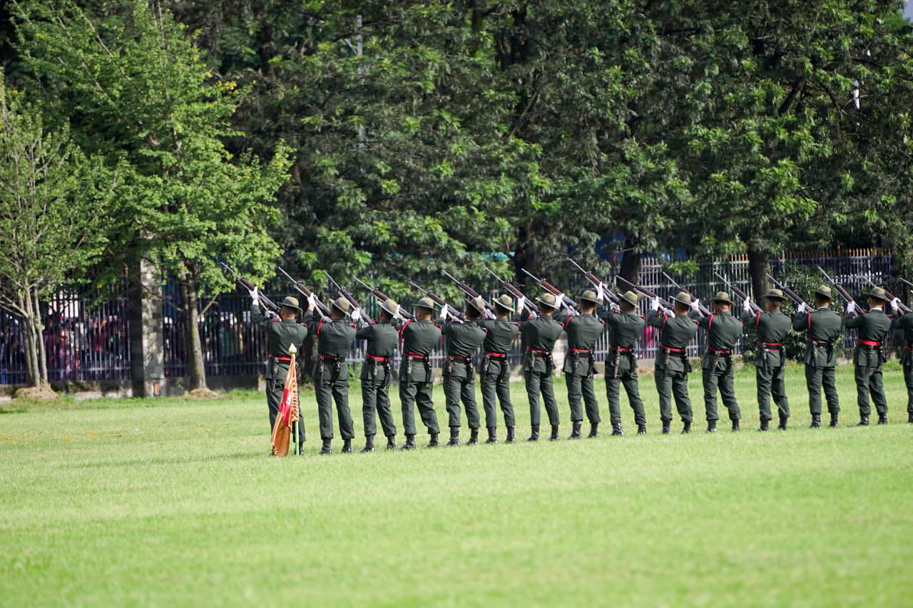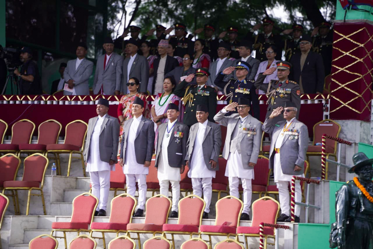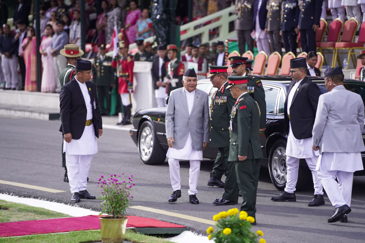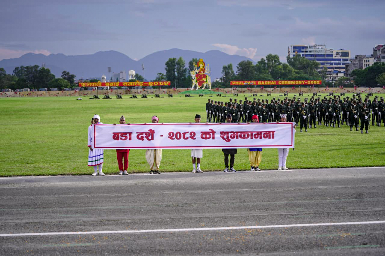 काठमाडौं। राष्ट्रपति रामचन्द्र पौडेलको प्रमुख आतिथ्यमा सैनिक मञ्च टुँडिखेलमा आज अपराह्न ‘फूलपाती बढाइँ समारोह-२०८२’ सम्पन्न गरिएको छ। समारोहमा नेपाली सेनाका परमाधिपति राष्ट्रपति पौडेलको सम्मानमा नेपाली सेनाले सलामी अर्पण गरेको थियो।
