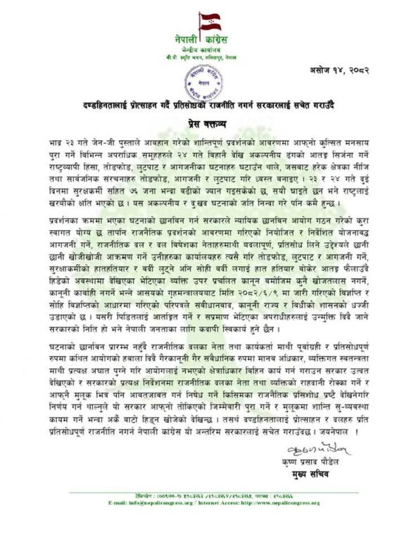 नेपाली कांग्रेसका मुख्य सचिव कृष्णप्रसाद पौडेलले बुधबार विज्ञप्ति जारी गर्दै सरकार राजनीतिक दलका नेता तथा कार्यकर्तामाथि पूर्वाग्रही र प्रतिशोधपूर्ण रूपमा गैरकानुनी, मानव अधिकार र व्यक्तिगत स्वतन्त्रतामाथि प्रत्यक्ष अघात पुग्ने गरी कार्य गर्न उद्यत रहेको बताएका छन्।