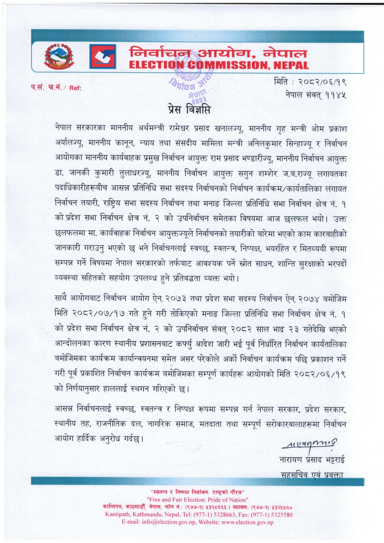 सरकार र निर्वाचन आयोगका पदाधिकारीबीचको छलफलपछि उपनिर्वाचनका सम्पूर्ण कार्यहरु अर्को मिति तय नहुँदासम्म स्थगित गरिएको आयोगका प्रवक्ता नारायण प्रसाद भट्टराई जानकारी दिए।
