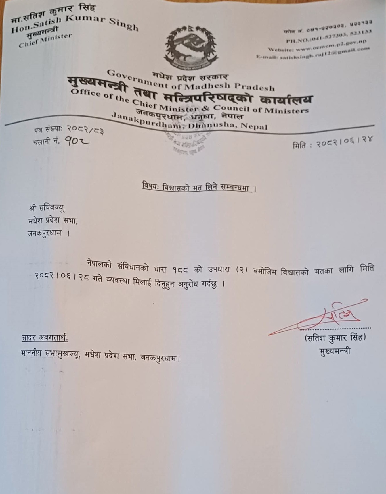 मुख्यमन्त्री सिंहले आज मधेश प्रदेश सभालाई पत्र लेखेर यहि असोज २८ गते विश्वासको मत लिने व्यवस्था मिलाई दिन आग्रह गरेका छन्।