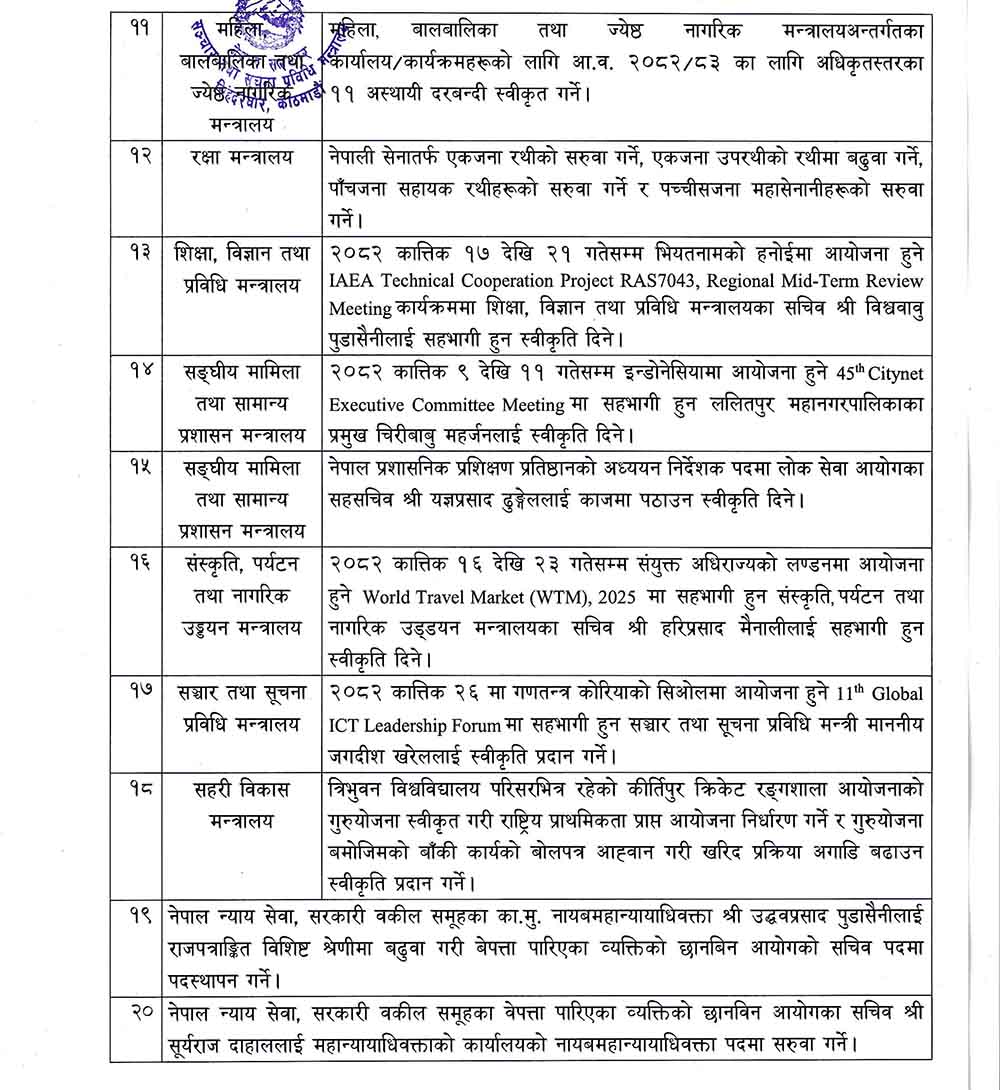 असोज ३० गतेको मन्त्रिपरिषद्को बैठकका २० निर्णय सार्बजनिक