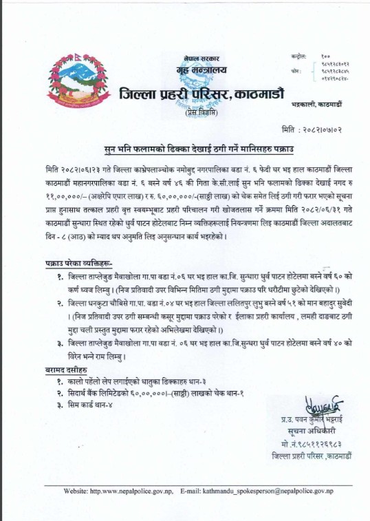 उनलाई सन भन्दै फलामको ढिक्का देखाएर उक्त रकम ठगी गरेको आरोपमा प्रहरीले पक्राउ गरेको हो। केसीसँगै प्रहरीले कणध्वज लिम्बु, मानबहादुर सुवेदी र राम लिम्बुलाई पनि पक्राउ गरेको छ।