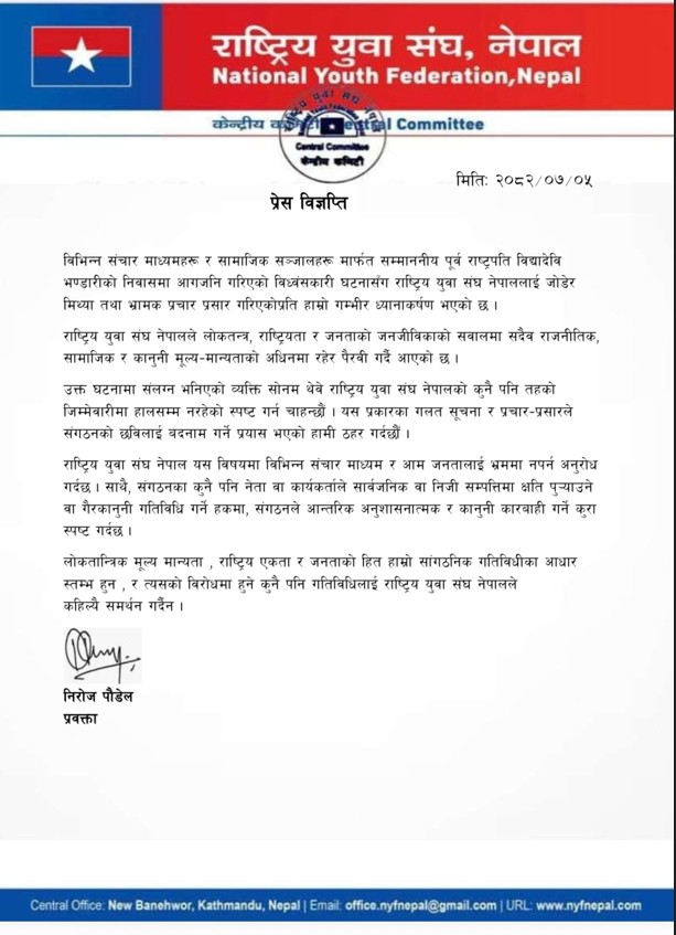 काठमाडौं। पूर्व राष्ट्रपति विद्यादेवि भण्डारीको निवासमा आगजनी गरिएको घटनासँग राष्ट्रिय युवा संघलाई जोडेर भ्रमक प्रचार गरेको भन्दै राष्ट्रिय युवा संघले आपत्ति जनाएको छ।