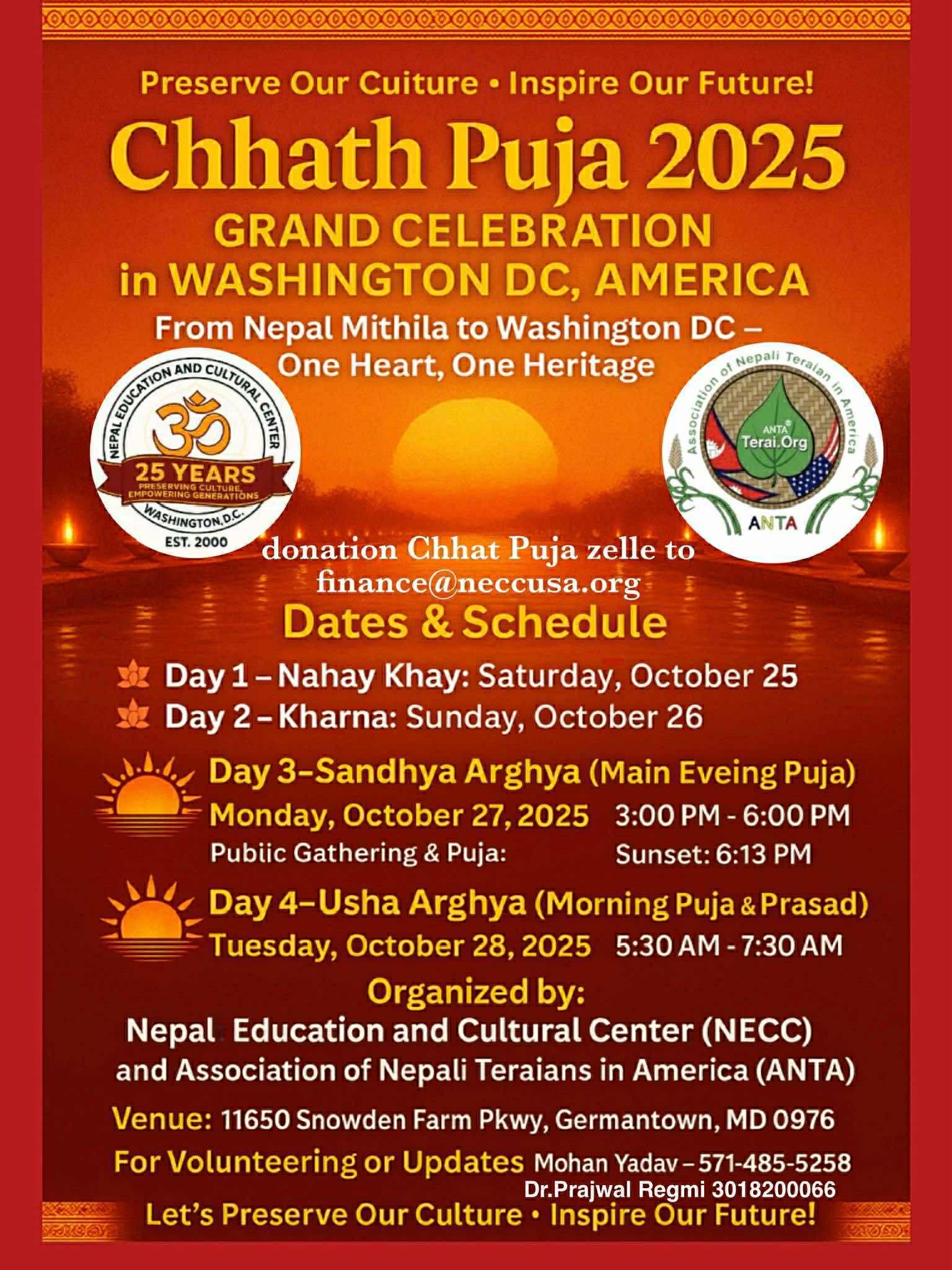 नेपाल एजेकेशन एन्ड कल्चर सेन्टर (एनईसीसी) र एशोसिएसन अफ नेपाली तराई इन अमेरिका (एनटीए)को आयोजनामा आज दिउँसो ३ बजेदेखि बेलुकी ६ बजेसम्म र भोली ५:३० देखि ७:३० सम्म छठ विशेष कार्यक्रम गरिने भएको हो।
