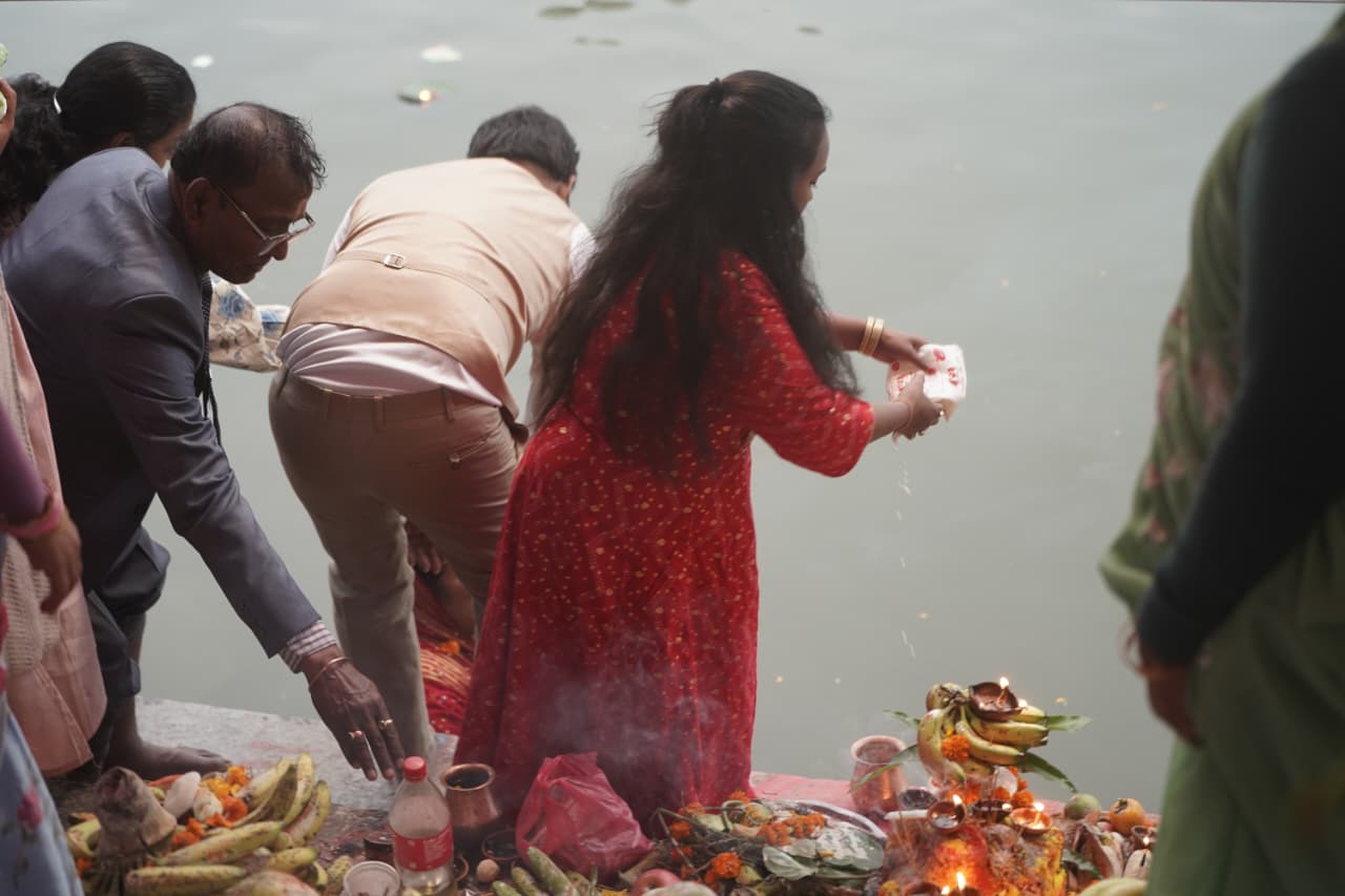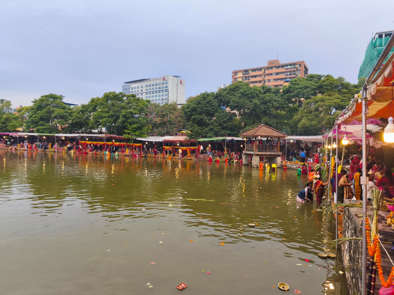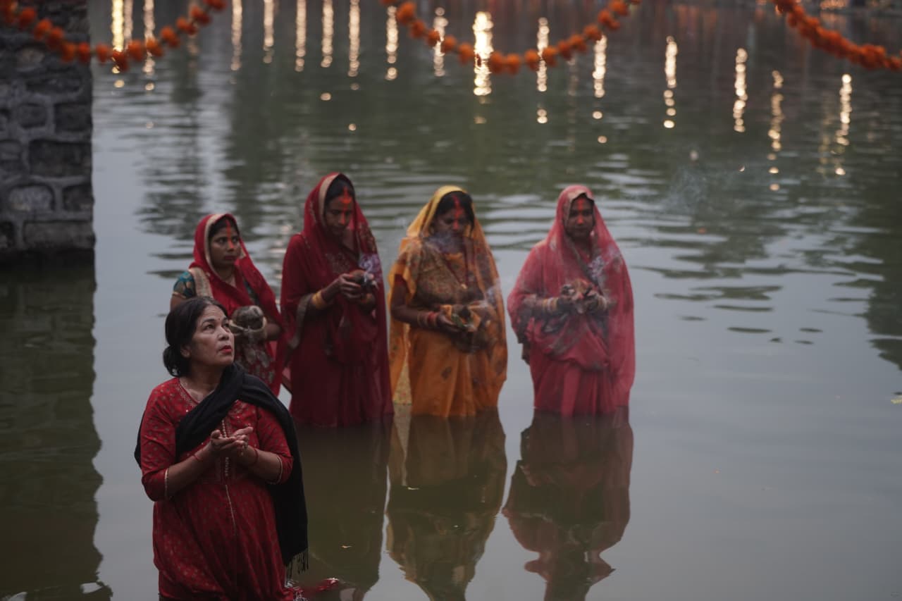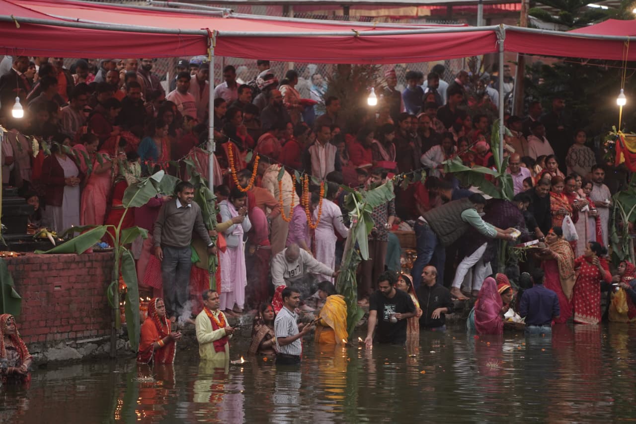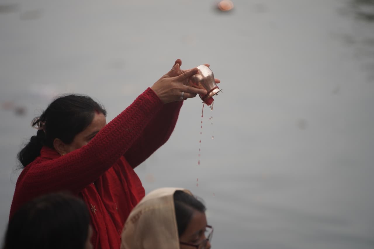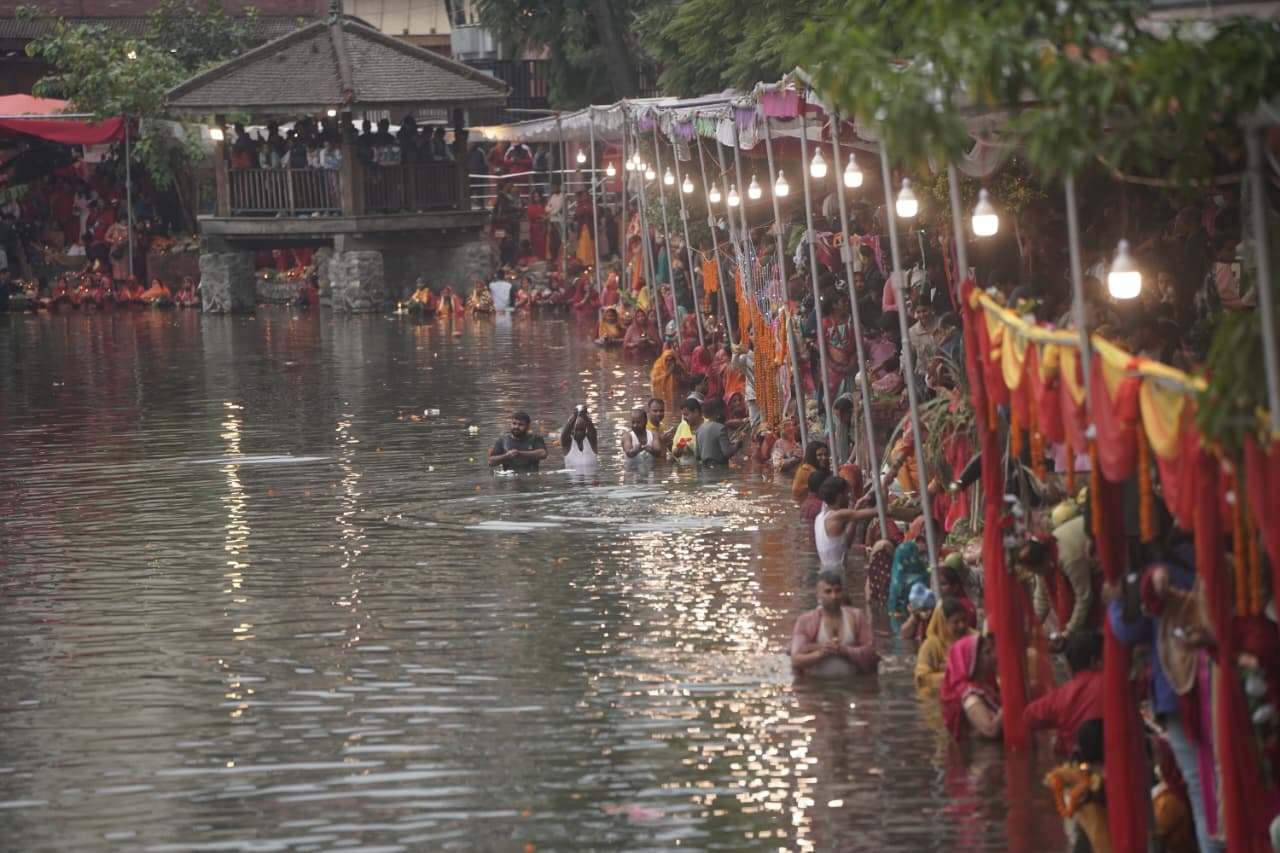 कमलपोखरीमा उदाउँदो सूर्यलाई अर्घ दिँदै (फोटो फिचर)